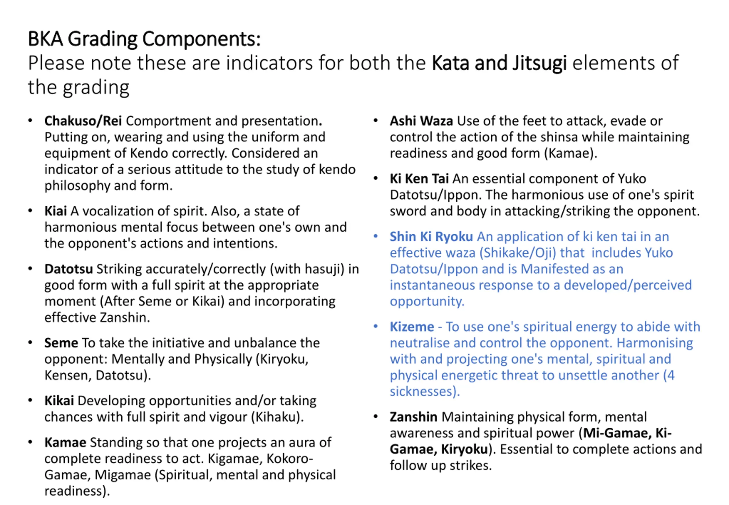 BKA Grading Components: BKA Grading Components: Please note these are indicators for both the Kata and the grading Kata and Jitsugi Jitsugi elements of Chakuso/Rei Comportment and presentation. Putting on, wearing and using the uniform and equipment of Kendo correctly. Considered an indicator of a serious attitude to the study of kendo philosophy and form. Ashi Waza Use of the feet to attack, evade or control the action of the shinsa while maintaining readiness and good form (Kamae). Ki Ken Tai An essential component of Yuko Datotsu/Ippon. The harmonious use of one's spirit sword and body in attacking/striking the opponent. Kiai A vocalization of spirit. Also, a state of harmonious mental focus between one's own and the opponent's actions and intentions. Shin Ki Ryoku An application of ki ken tai in an effective waza (Shikake/Oji) that includes Yuko Datotsu/Ippon and is Manifested as an instantaneous response to a developed/perceived opportunity. Datotsu Striking accurately/correctly (with hasuji) in good form with a full spirit at the appropriate moment (After Seme or Kikai) and incorporating effective Zanshin. Kizeme - To use one's spiritual energy to abide with neutralise and control the opponent. Harmonising with and projecting one's mental, spiritual and physical energetic threat to unsettle another (4 sicknesses). Seme To take the initiative and unbalance the opponent: Mentally and Physically (Kiryoku, Kensen, Datotsu). Kikai Developing opportunities and/or taking chances with full spirit and vigour (Kihaku). Zanshin Maintaining physical form, mental awareness and spiritual power (Mi-Gamae, Ki- Gamae, Kiryoku). Essential to complete actions and follow up strikes. Kamae Standing so that one projects an aura of complete readiness to act. Kigamae, Kokoro- Gamae, Migamae (Spiritual, mental and physical readiness).