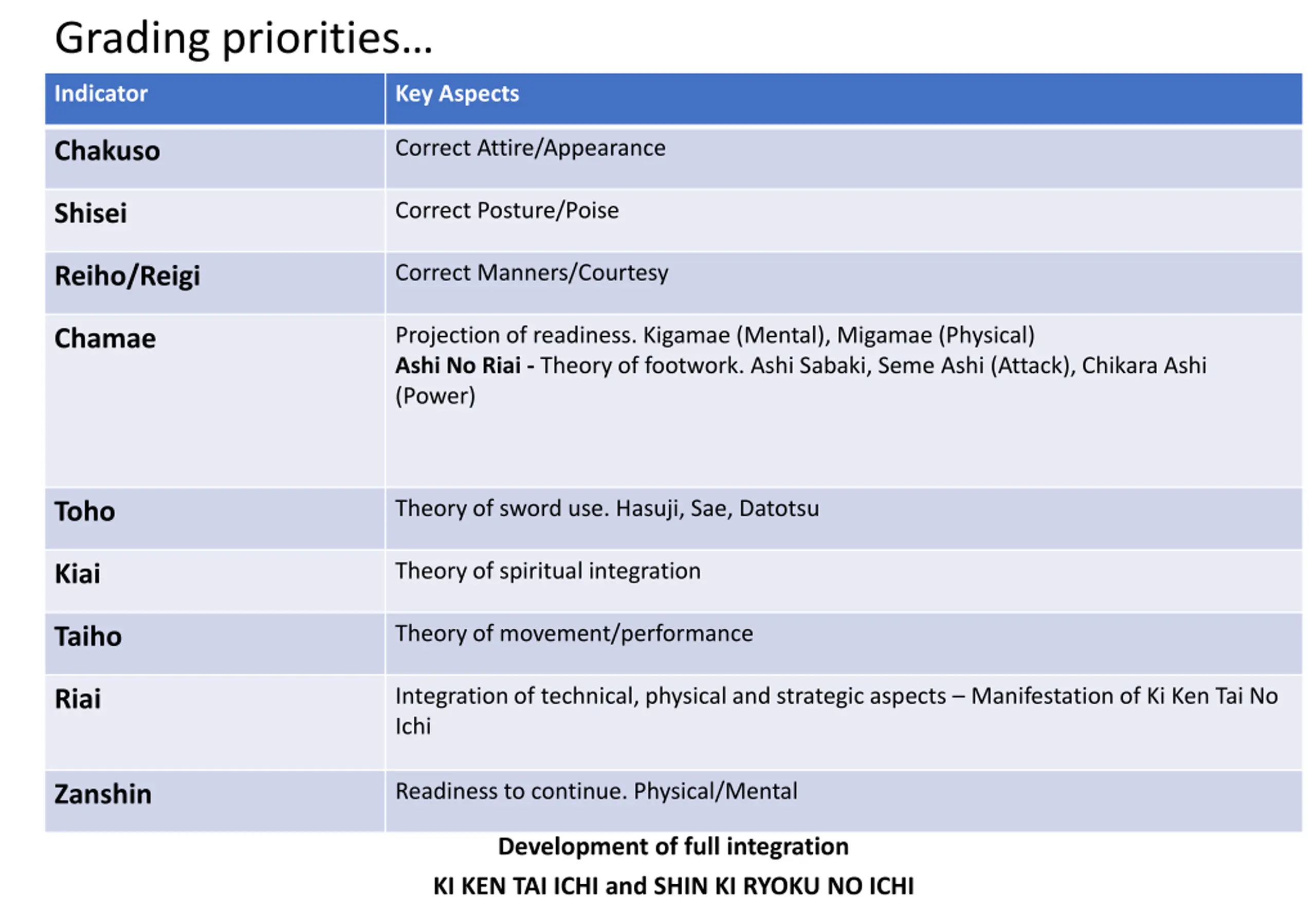 Grading priorities Indicator Key Aspects Correct Attire/Appearance Chakuso Correct Posture/Poise Shisei Correct Manners/Courtesy Reiho/Reigi Projection of readiness. Kigamae (Mental), Migamae (Physical) Ashi No Riai - Theory of footwork. Ashi Sabaki, Seme Ashi (Attack), Chikara Ashi (Power) Chamae Grading Checklist Toho Theory of sword use. Hasuji, Sae, Datotsu Theory of spiritual integration Kiai Theory of movement/performance Taiho Integration of technical, physical and strategic aspects Manifestation of Ki Ken Tai No Ichi Riai Readiness to continue. Physical/Mental Zanshin Development of full integration KI KEN TAI ICHI and SHIN KI RYOKU NO ICHI