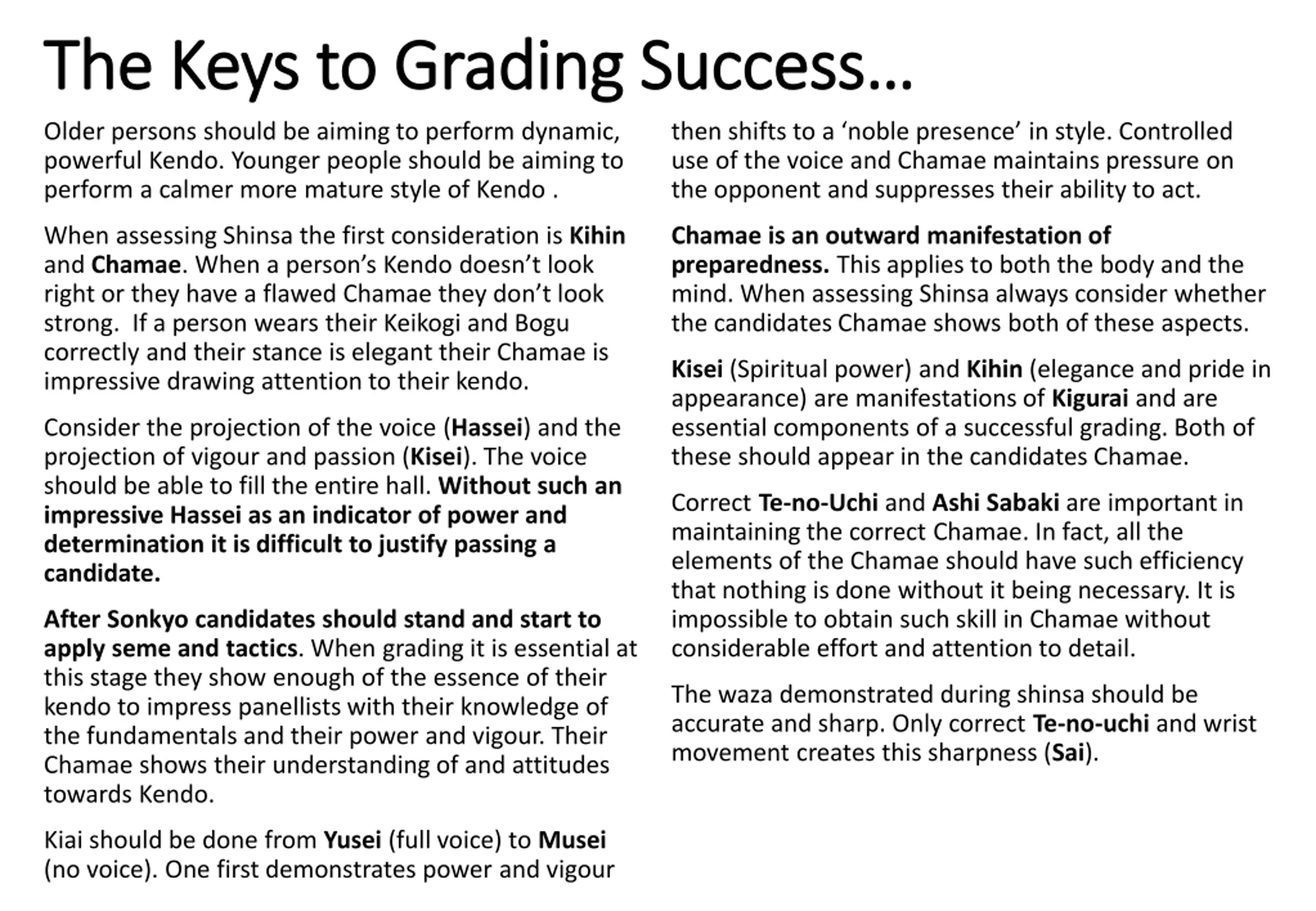 The Keys to Grading Success The Keys to Grading Success Older persons should be aiming to perform dynamic, powerful Kendo. Younger people should be aiming to perform a calmer more mature style of Kendo . then shifts to a noble presence in style. Controlled use of the voice and Chamae maintains pressure on the opponent and suppresses their ability to act. When assessing Shinsa the first consideration is Kihin and Chamae. When a person s Kendo doesn t look right or they have a flawed Chamae they don t look strong. If a person wears their Keikogi and Bogu correctly and their stance is elegant their Chamae is impressive drawing attention to their kendo. Chamae is an outward manifestation of preparedness. This applies to both the body and the mind. When assessing Shinsa always consider whether the candidates Chamae shows both of these aspects. Kisei (Spiritual power) and Kihin (elegance and pride in appearance) are manifestations of Kigurai and are essential components of a successful grading. Both of these should appear in the candidates Chamae. Consider the projection of the voice(Hassei) and the projection of vigour and passion (Kisei). The voice should be able to fill the entire hall. Without such an impressive Hassei as an indicator of power and determination it is difficult to justify passing a candidate. Correct Te-no-Uchi and Ashi Sabaki are important in maintaining the correct Chamae. In fact, all the elements of the Chamae should have such efficiency that nothing is done without it being necessary. It is impossible to obtain such skill in Chamae without considerable effort and attention to detail. After Sonkyo candidates should stand and start to apply seme and tactics. When grading it is essential at this stage they show enough of the essence of their kendo to impress panellists with their knowledge of the fundamentals and their power and vigour. Their Chamae shows their understanding of and attitudes towards Kendo. The waza demonstrated during shinsa should be accurate and sharp. Only correct Te-no-uchi and wrist movement creates this sharpness (Sai). Kiai should be done from Yusei (full voice) to Musei (no voice). One first demonstrates power and vigour