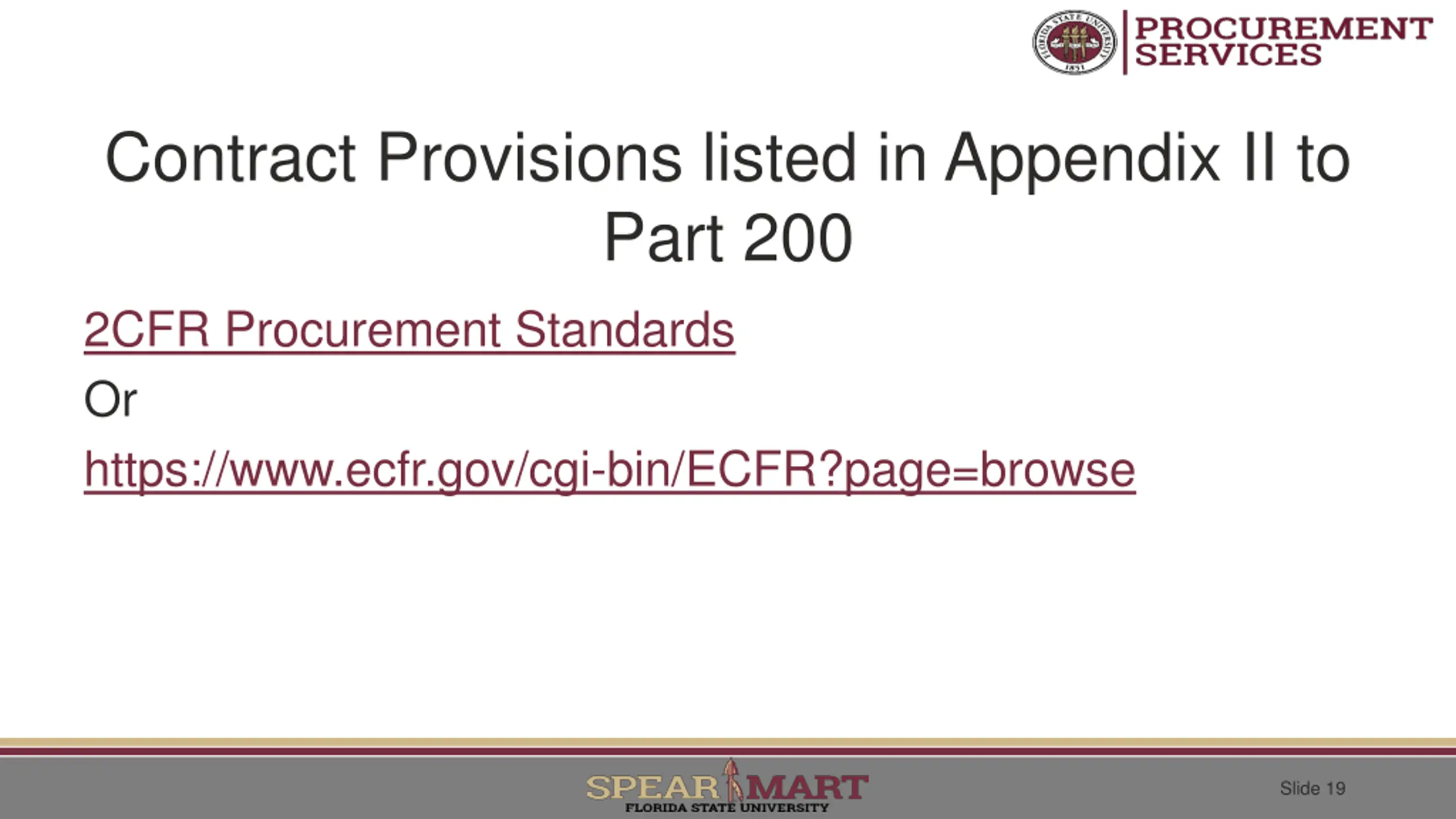 Contract Provisions listed in Appendix II to Part 200 2CFR Procurement Standards Or https://www.ecfr.gov/cgi-bin/ECFR?page=browse Slide 19