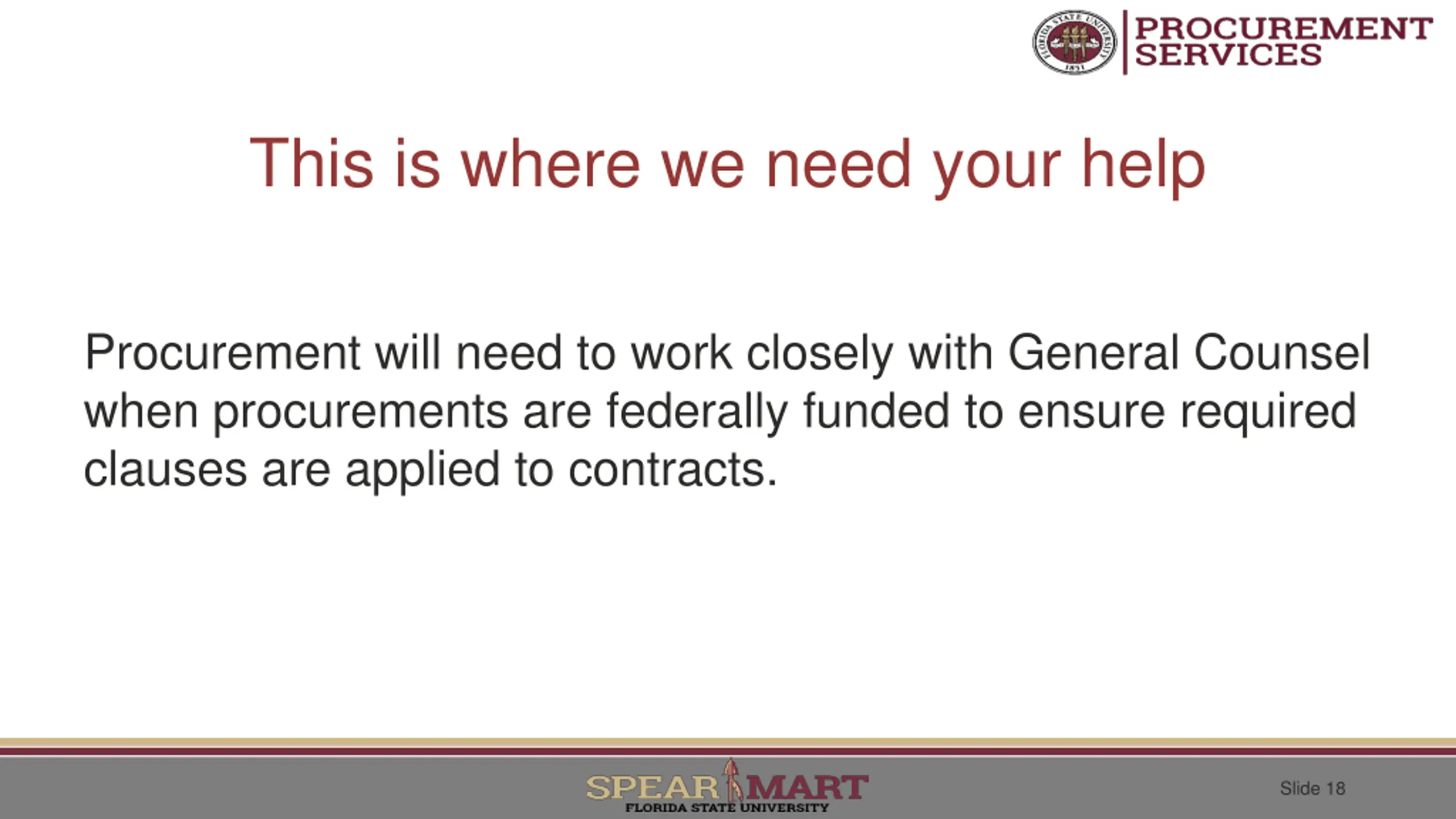 This is where we need your help Procurement will need to work closely with General Counsel when procurements are federally funded to ensure required clauses are applied to contracts. Slide 18