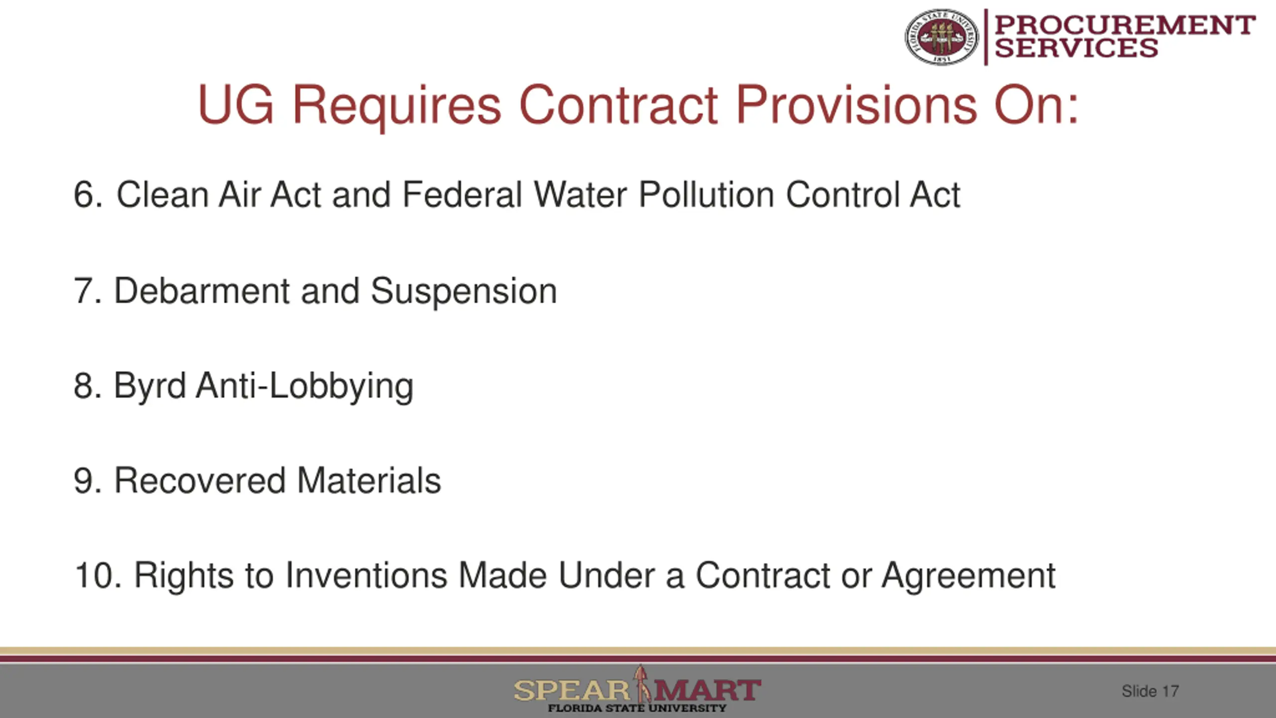 UG Requires Contract Provisions On: 1. Remedies for breach 2. Termination for cause and convenience 3. EEO 4. Bacon-Davis wage requirements 5. Work Hours and Safety Standards Slide 16