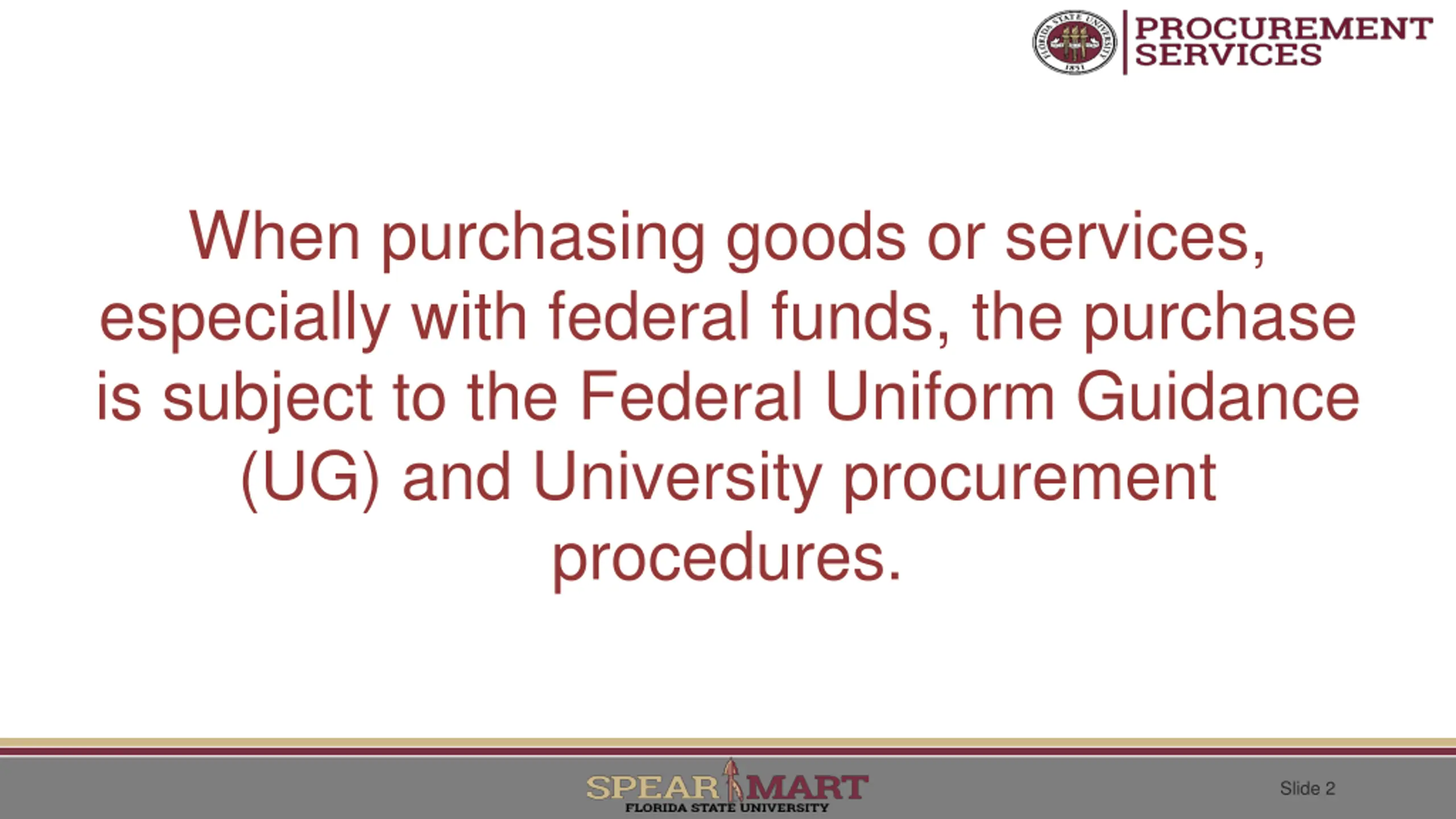When purchasing goods or services, especially with federal funds, the purchase is subject to the Federal Uniform Guidance (UG) and University procurement procedures. Slide 2