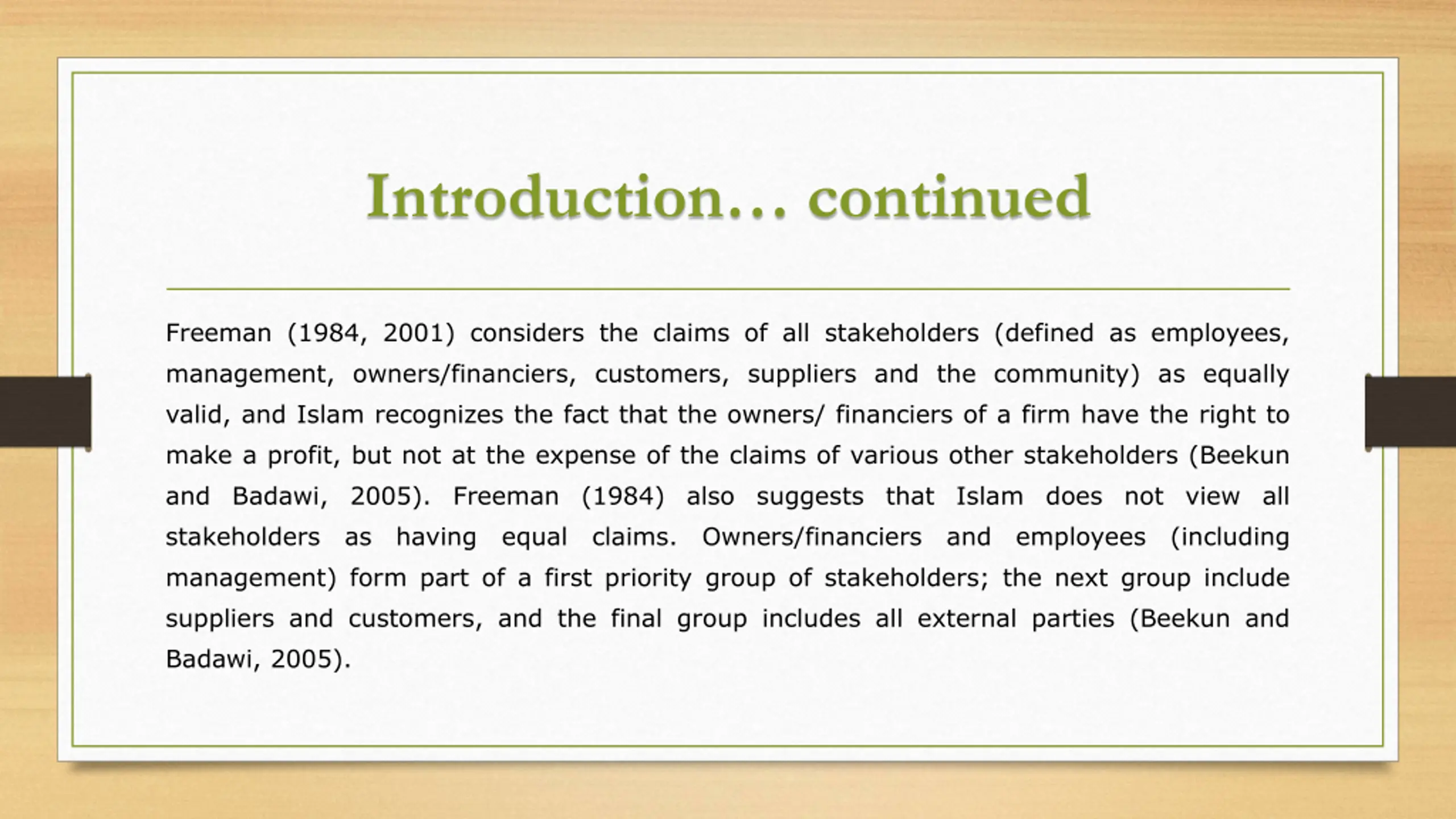 Introduction continued Freeman (1984, 2001) considers the claims of all stakeholders (defined as employees, management, owners/financiers, customers, suppliers and the community) as equally valid, and Islam recognizes the fact that the owners/ financiers of a firm have the right to make a profit, but not at the expense of the claims of various other stakeholders (Beekun and Badawi, 2005). Freeman (1984) also suggests that Islam does not view all stakeholders as having equal claims. Owners/financiers management) form part of a first priority group of stakeholders; the next group include suppliers and customers, and the final group includes all external parties (Beekun and Badawi, 2005). and employees (including