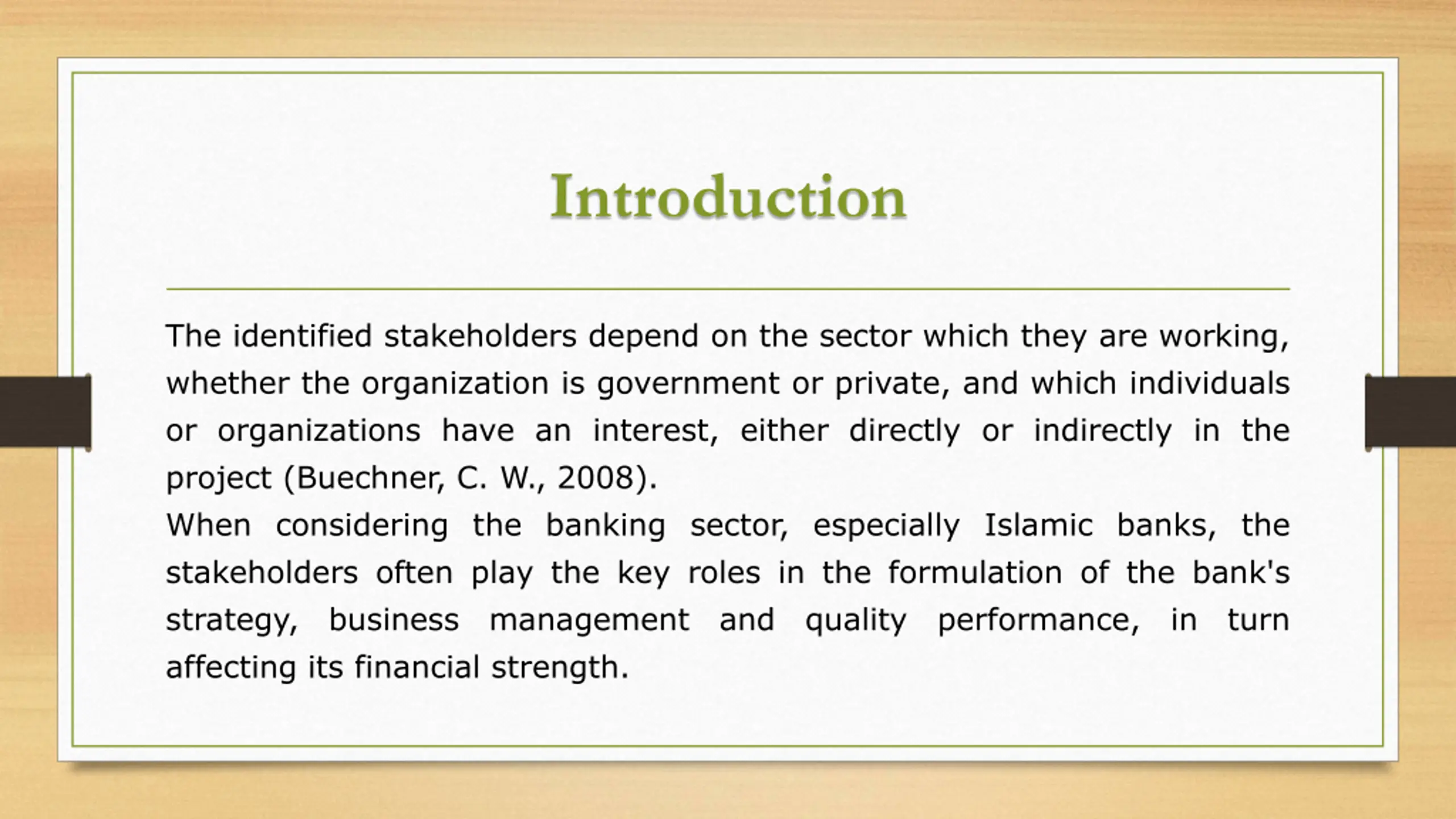 Introduction The identified stakeholders depend on the sector which they are working, whether the organization is government or private, and which individuals or organizations have an interest, either directly or indirectly in the project (Buechner, C. W., 2008). When considering the banking sector, especially Islamic banks, the stakeholders often play the key roles in the formulation of the bank's strategy, business management and affecting its financial strength. quality performance, in turn
