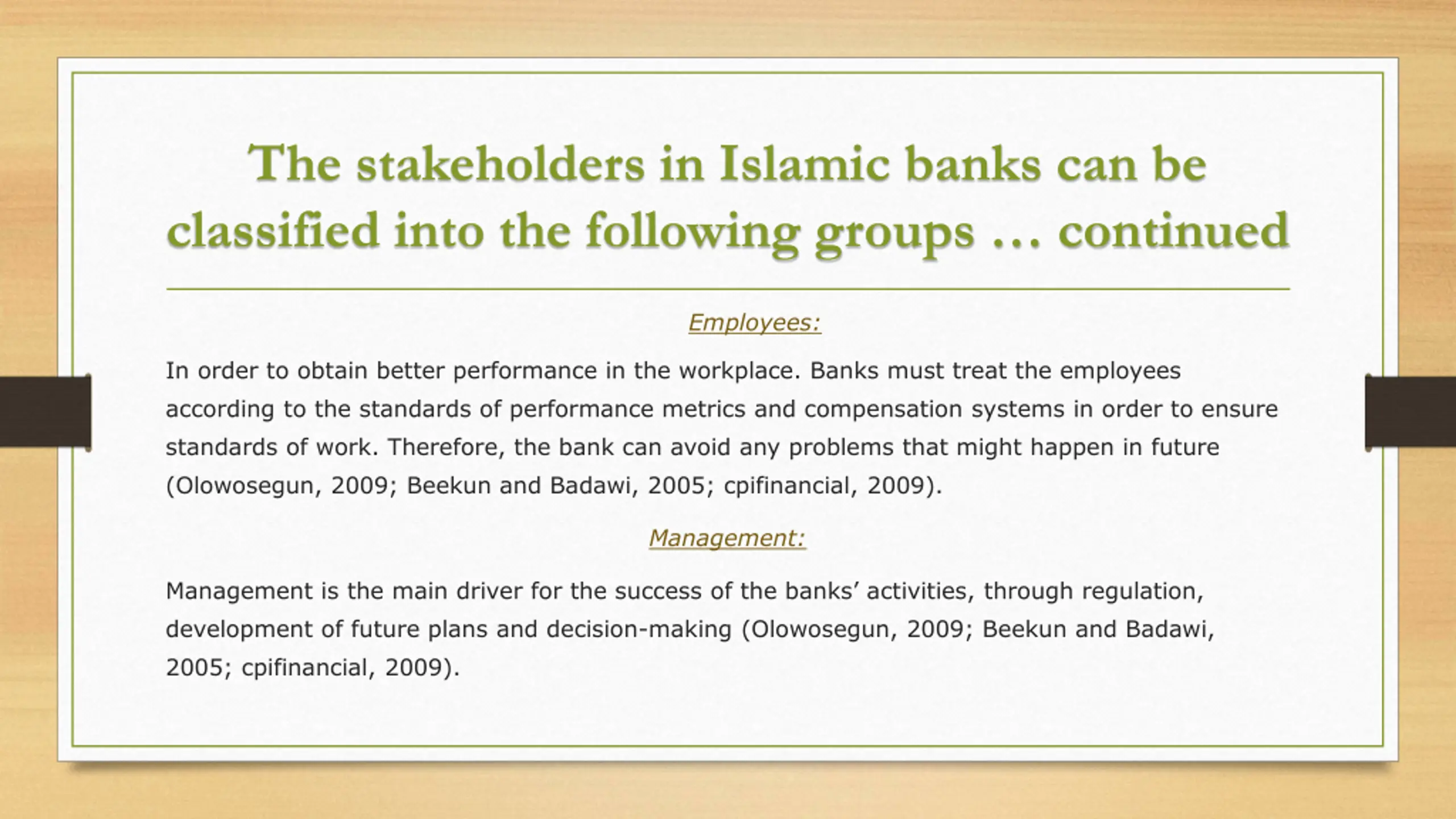 The stakeholders in Islamic banks can be classified into the following groups continued Employees: In order to obtain better performance in the workplace. Banks must treat the employees according to the standards of performance metrics and compensation systems in order to ensure standards of work. Therefore, the bank can avoid any problems that might happen in future (Olowosegun, 2009; Beekun and Badawi, 2005; cpifinancial, 2009). Management: Management is the main driver for the success of the banks activities, through regulation, development of future plans and decision-making (Olowosegun, 2009; Beekun and Badawi, 2005; cpifinancial, 2009).