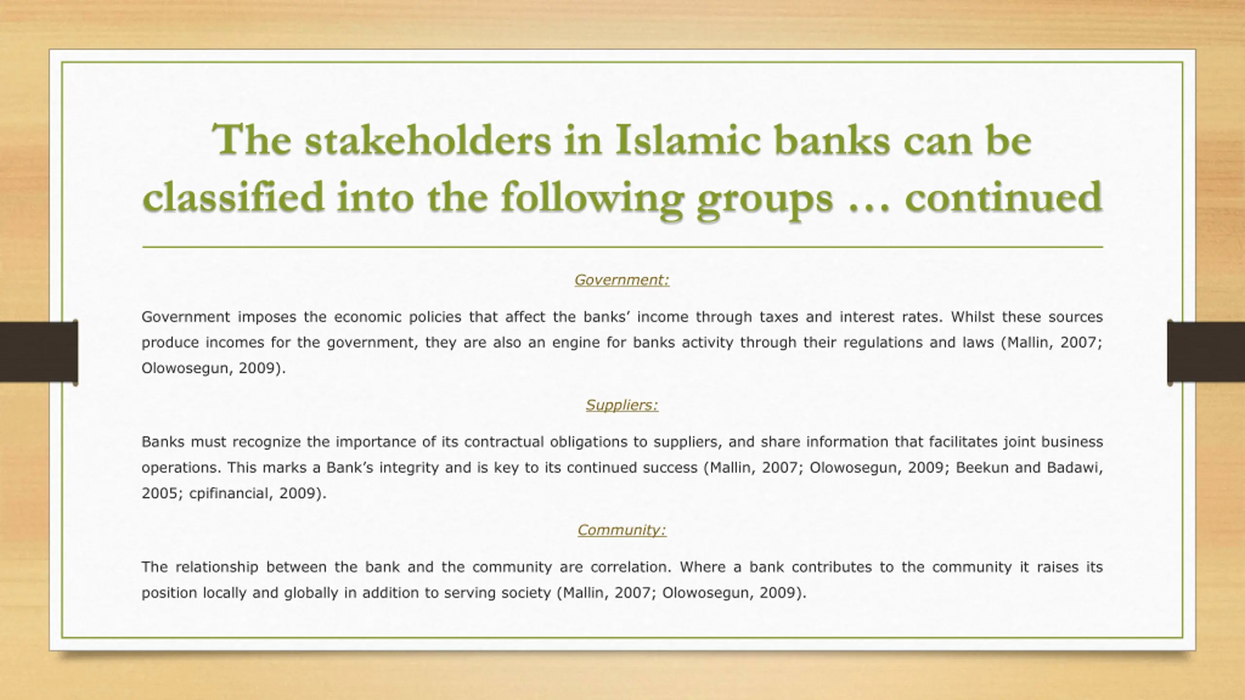 The stakeholders in Islamic banks can be classified into the following groups continued Government: Government imposes the economic policies that affect the banks income through taxes and interest rates. Whilst these sources produce incomes for the government, they are also an engine for banks activity through their regulations and laws (Mallin, 2007; Olowosegun, 2009). Suppliers: Banks must recognize the importance of its contractual obligations to suppliers, and share information that facilitates joint business operations. This marks a Bank s integrity and is key to its continued success (Mallin, 2007; Olowosegun, 2009; Beekun and Badawi, 2005; cpifinancial, 2009). Community: The relationship between the bank and the community are correlation. Where a bank contributes to the community it raises its position locally and globally in addition to serving society (Mallin, 2007; Olowosegun, 2009).