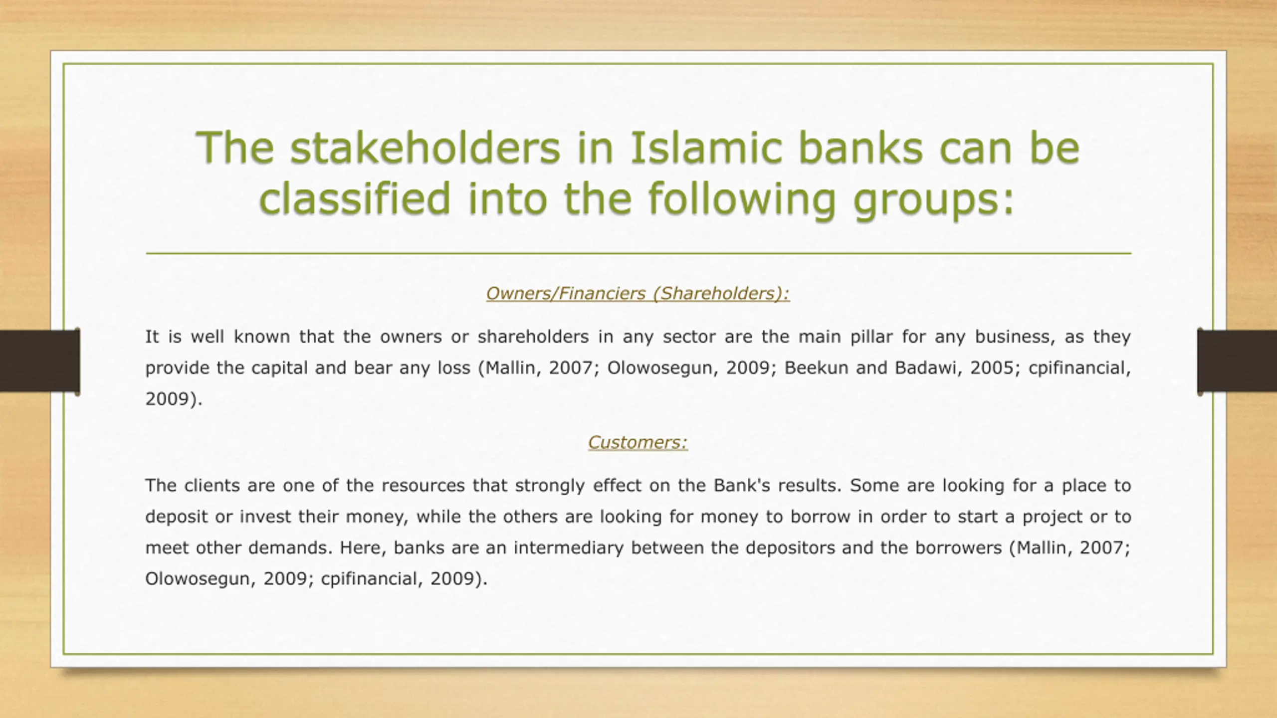 The stakeholders in Islamic banks can be classified into the following groups: Owners/Financiers (Shareholders): It is well known that the owners or shareholders in any sector are the main pillar for any business, as they provide the capital and bear any loss (Mallin, 2007; Olowosegun, 2009; Beekun and Badawi, 2005; cpifinancial, 2009). Customers: The clients are one of the resources that strongly effect on the Bank's results. Some are looking for a place to deposit or invest their money, while the others are looking for money to borrow in order to start a project or to meet other demands. Here, banks are an intermediary between the depositors and the borrowers (Mallin, 2007; Olowosegun, 2009; cpifinancial, 2009).
