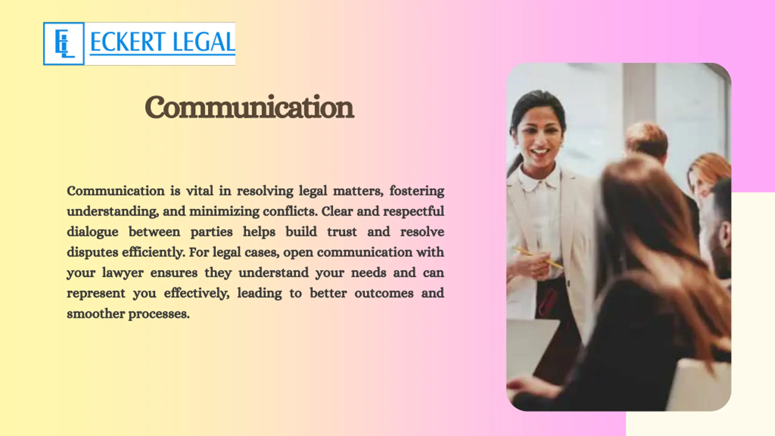 Communication Communication is vital in resolving legal matters, fostering understanding, and minimizing conflicts. Clear and respectful dialogue between parties helps build trust and resolve disputes efficiently. For legal cases, open communication with your lawyer ensures they understand your needs and can represent you effectively, leading to better outcomes and smoother processes.