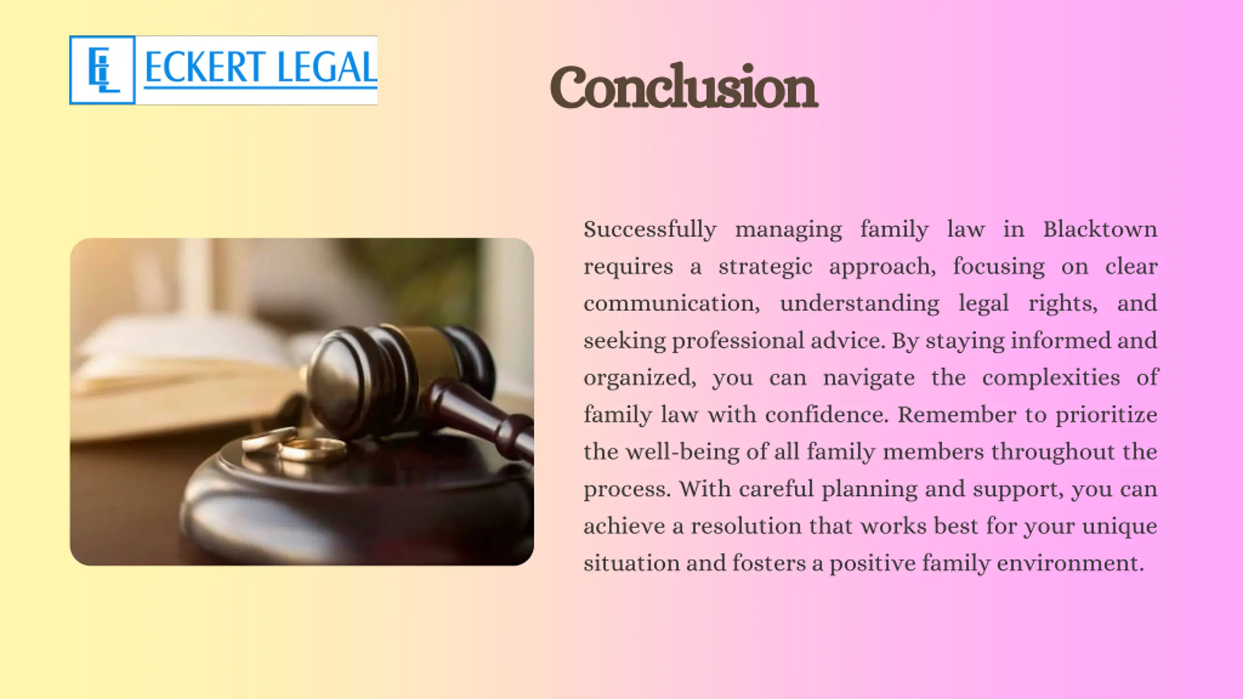 Conclusion Successfully managing family law in Blacktown requires a strategic approach, focusing on clear communication, understanding legal rights, and seeking professional advice. By staying informed and organized, you can navigate the complexities of family law with confidence. Remember to prioritize the well-being of all family members throughout the process. With careful planning and support, you can achieve a resolution that works best for your unique situation and fosters a positive family environment.