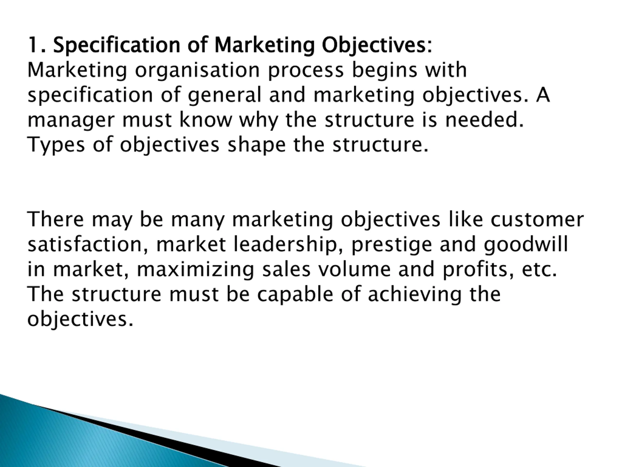 1. Specification of Marketing Objectives: Marketing organisation process begins with specification of general and marketing objectives. A manager must know why the structure is needed. Types of objectives shape the structure. 1. Specification of Marketing Objectives: There may be many marketing objectives like customer satisfaction, market leadership, prestige and goodwill in market, maximizing sales volume and profits, etc. The structure must be capable of achieving the objectives.