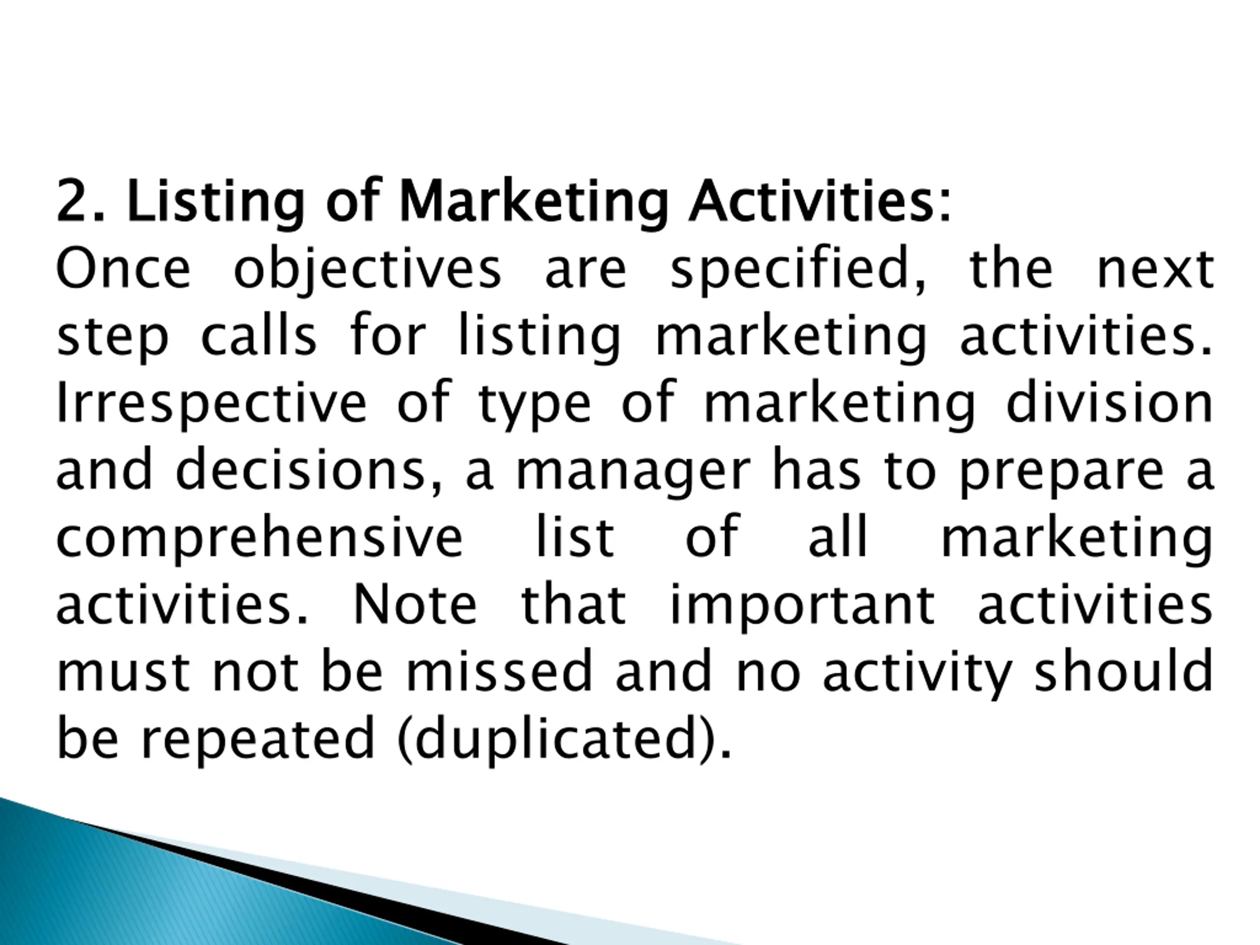 2 2. . Listing Once objectives are specified, the next step calls for listing marketing activities. Irrespective of type of marketing division and decisions, a manager has to prepare a comprehensive activities. Note that important activities must not be missed and no activity should be repeated (duplicated). Listing of of Marketing Marketing Activities Activities: : list of all marketing