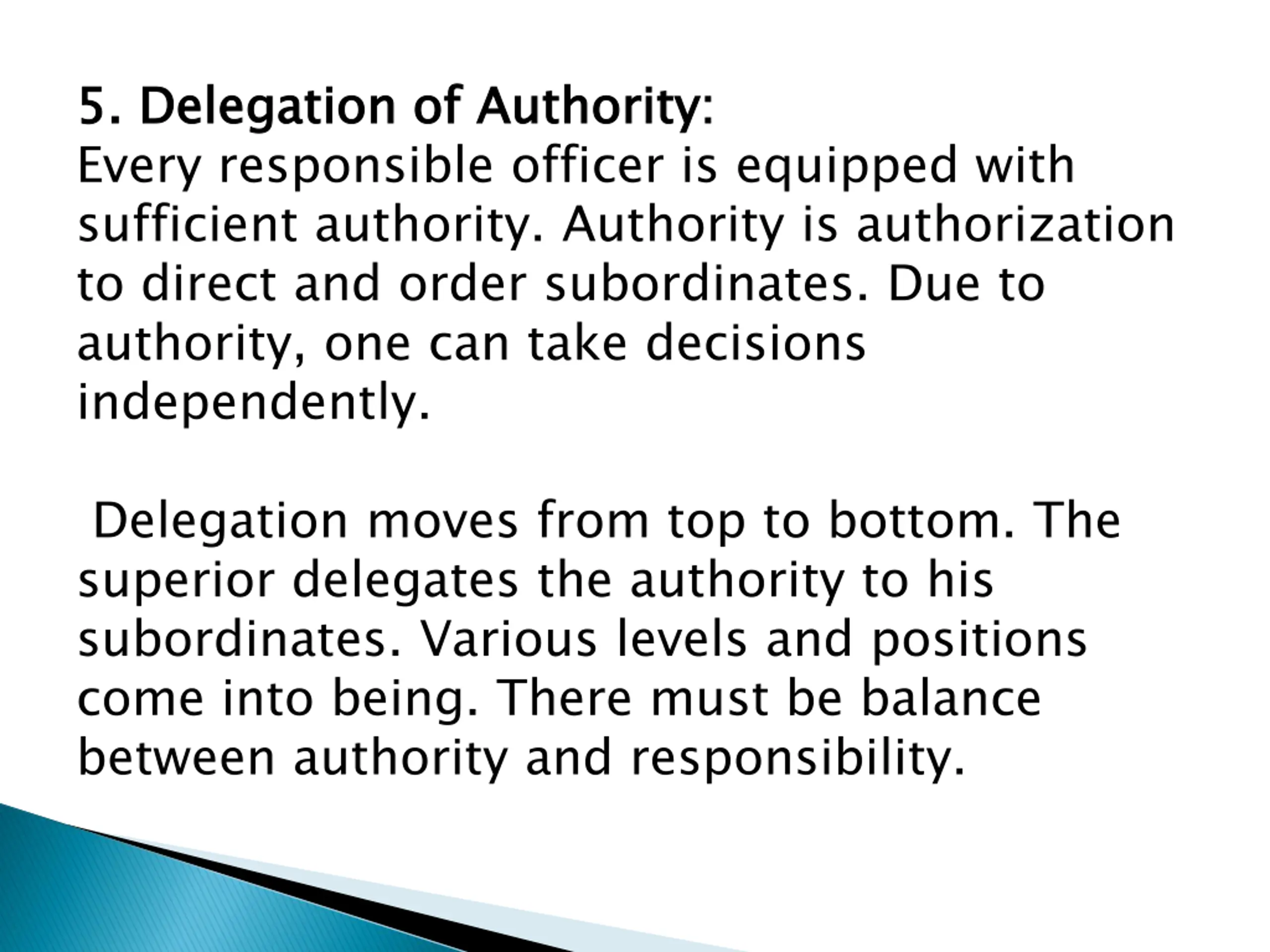 5. Delegation of Authority: Every responsible officer is equipped with sufficient authority. Authority is authorization to direct and order subordinates. Due to authority, one can take decisions independently. 5. Delegation of Authority: Delegation moves from top to bottom. The superior delegates the authority to his subordinates. Various levels and positions come into being. There must be balance between authority and responsibility.