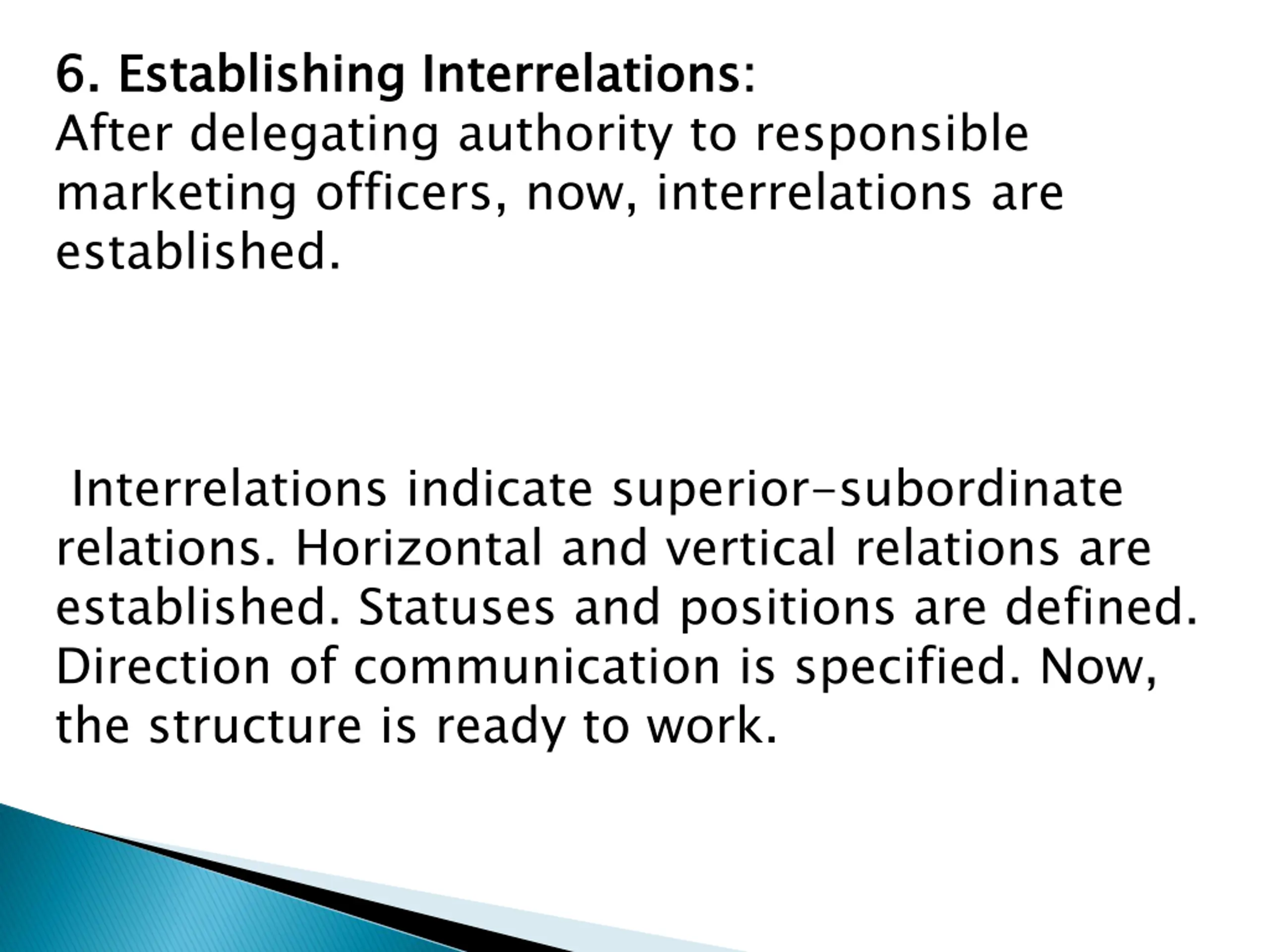 6. Establishing Interrelations: After delegating authority to responsible marketing officers, now, interrelations are established. 6. Establishing Interrelations: Interrelations indicate superior-subordinate relations. Horizontal and vertical relations are established. Statuses and positions are defined. Direction of communication is specified. Now, the structure is ready to work.