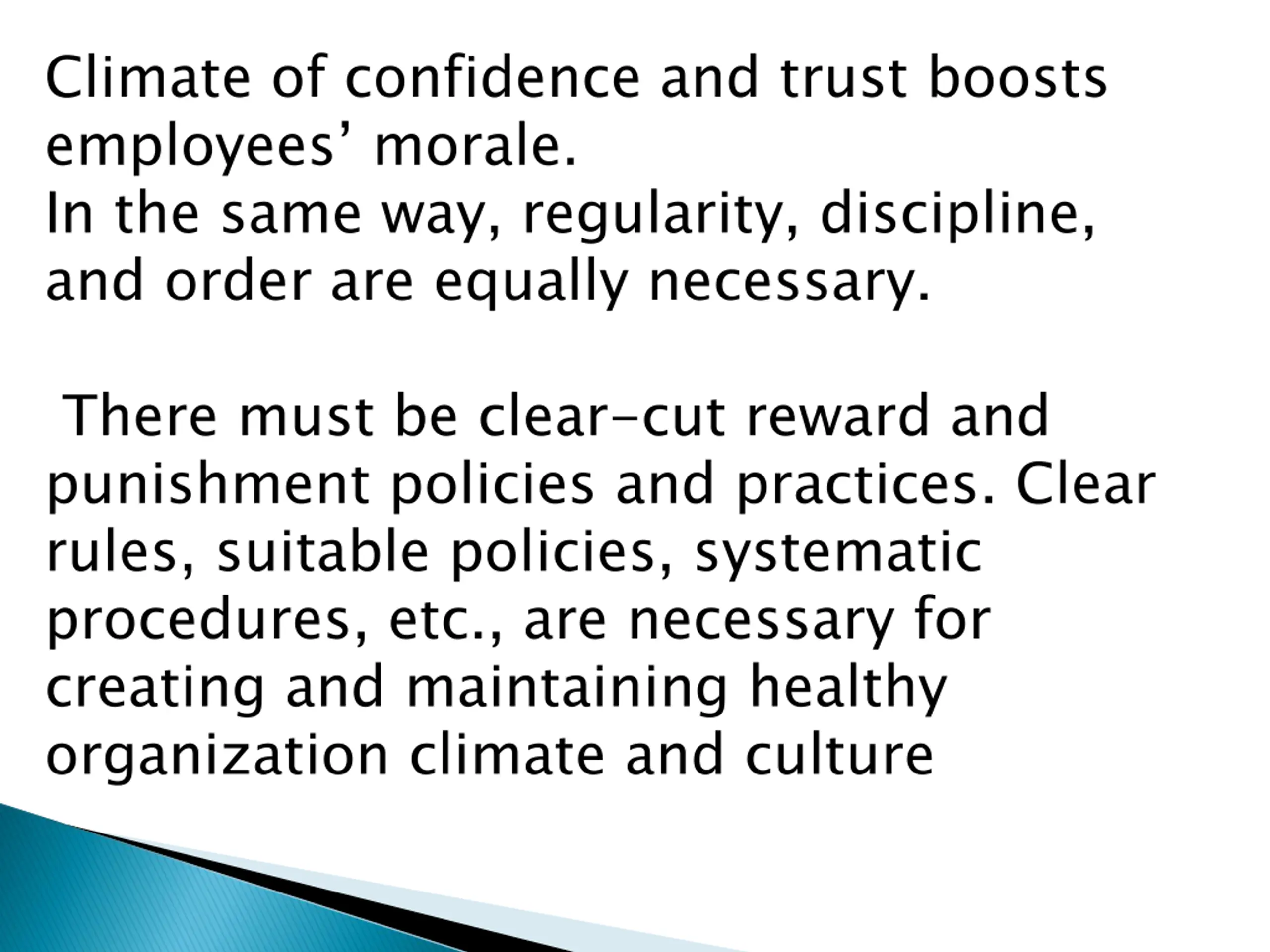 Climate of confidence and trust boosts employees morale. In the same way, regularity, discipline, and order are equally necessary. There must be clear-cut reward and punishment policies and practices. Clear rules, suitable policies, systematic procedures, etc., are necessary for creating and maintaining healthy organization climate and culture
