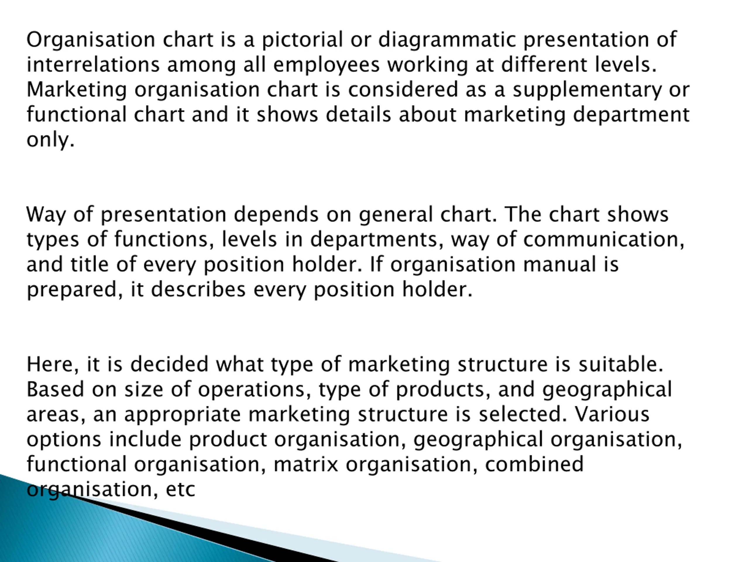 Organisation chart is a pictorial or diagrammatic presentation of interrelations among all employees working at different levels. Marketing organisation chart is considered as a supplementary or functional chart and it shows details about marketing department only. Way of presentation depends on general chart. The chart shows types of functions, levels in departments, way of communication, and title of every position holder. If organisation manual is prepared, it describes every position holder. Here, it is decided what type of marketing structure is suitable. Based on size of operations, type of products, and geographical areas, an appropriate marketing structure is selected. Various options include product organisation, geographical organisation, functional organisation, matrix organisation, combined organisation, etc