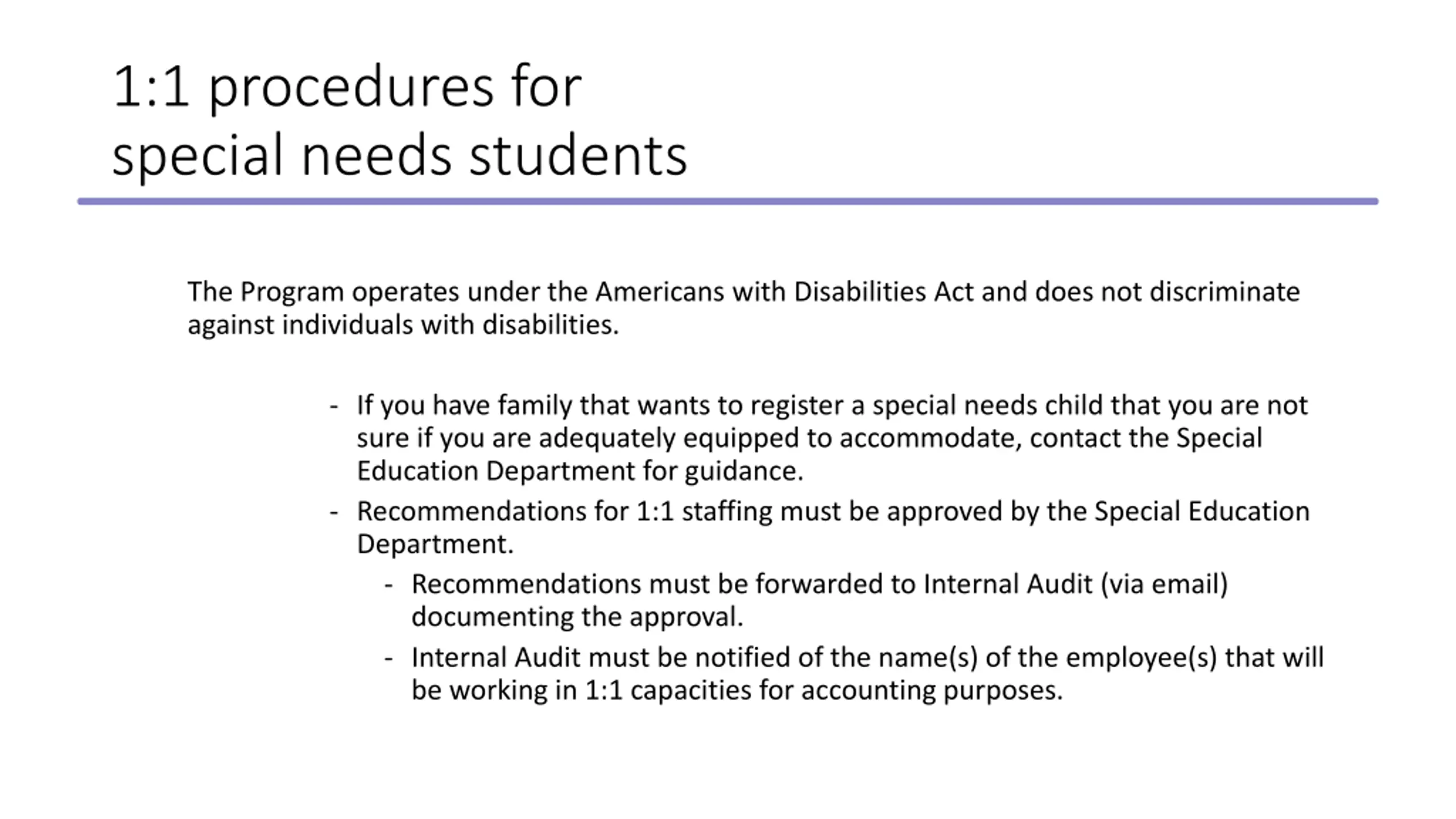 1:1 procedures for special needs students The Program operates under the Americans with Disabilities Act and does not discriminate against individuals with disabilities. - If you have family that wants to register a special needs child that you are not sure if you are adequately equipped to accommodate, contact the Special Education Department for guidance. - Recommendations for 1:1 staffing must be approved by the Special Education Department. - Recommendations must be forwarded to Internal Audit (via email) documenting the approval. - Internal Audit must be notified of the name(s) of the employee(s) that will be working in 1:1 capacities for accounting purposes.