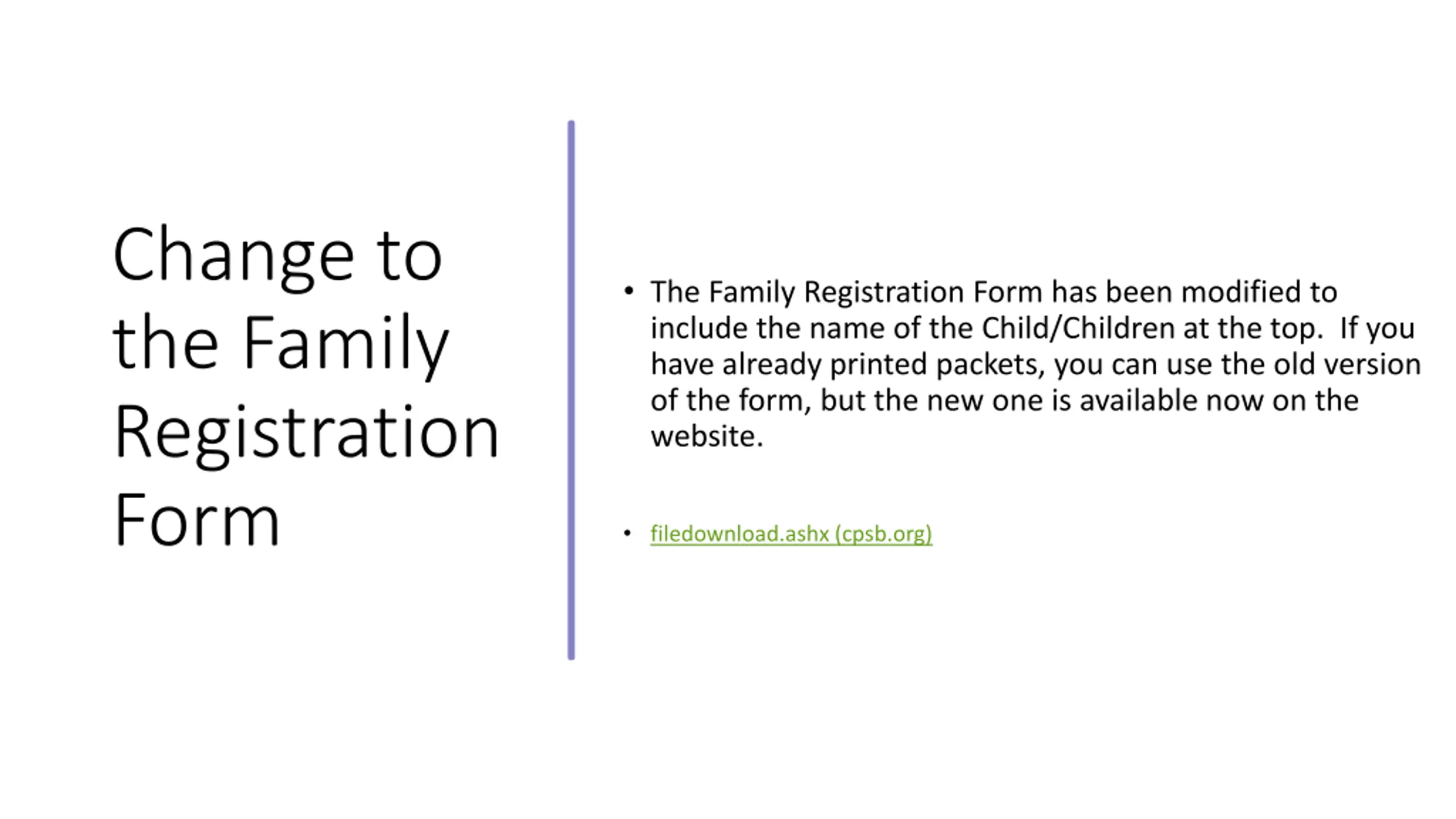 Change to the Family Registration Form The Family Registration Form has been modified to include the name of the Child/Children at the top. If you have already printed packets, you can use the old version of the form, but the new one is available now on the website. filedownload.ashx (cpsb.org)