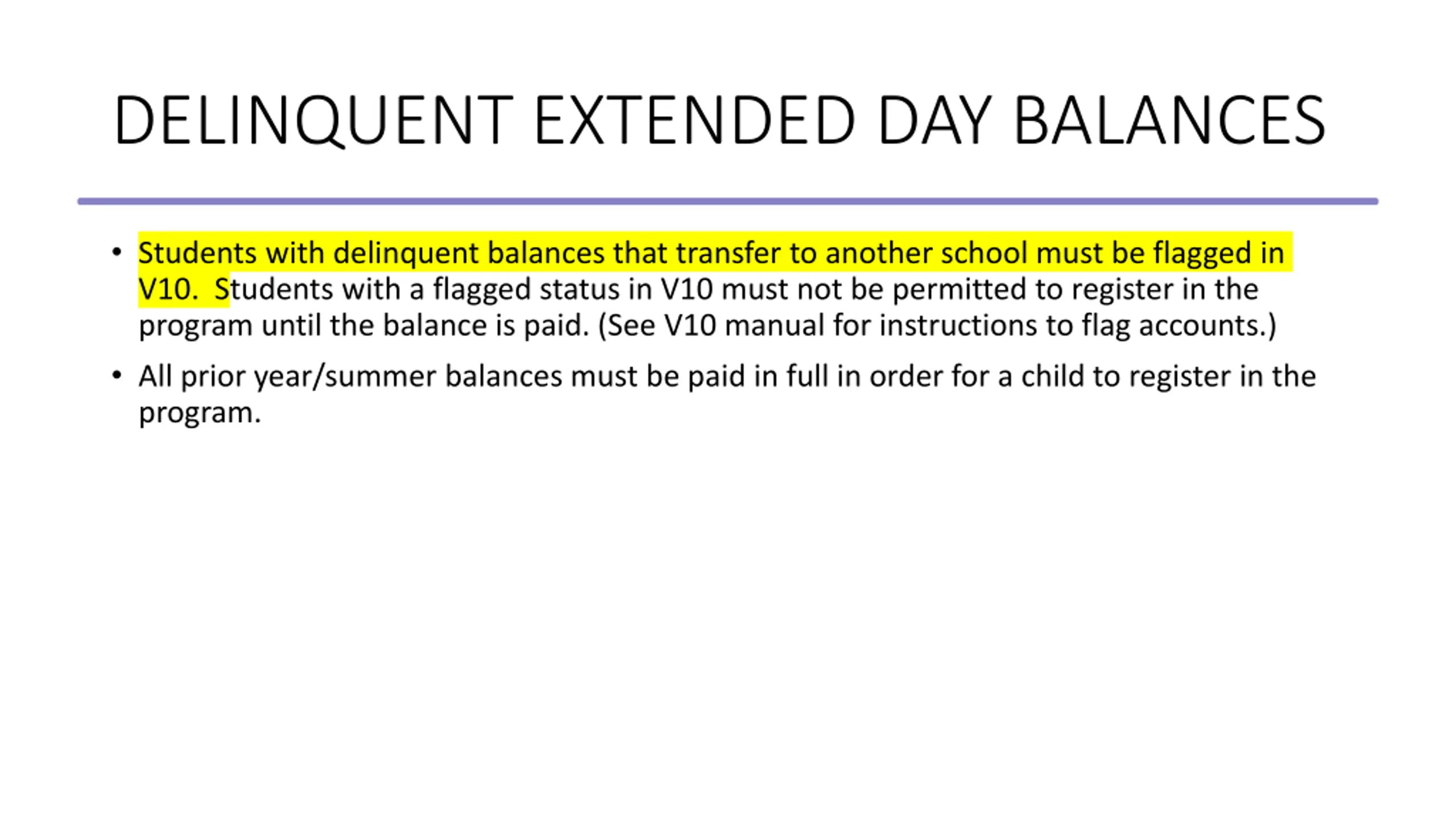 DELINQUENT EXTENDED DAY BALANCES Students with delinquent balances that transfer to another school must be flagged in V10. Students with a flagged status in V10 must not be permitted to register in the program until the balance is paid. (See V10 manual for instructions to flag accounts.) All prior year/summer balances must be paid in full in order for a child to register in the program.