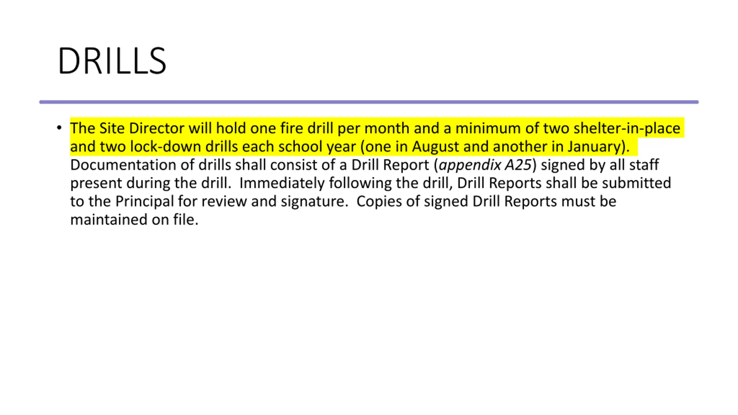DRILLS The Site Director will hold one fire drill per month and a minimum of two shelter-in-place and two lock-down drills each school year (one in August and another in January). Documentation of drills shall consist of a Drill Report (appendix A25) signed by all staff present during the drill. Immediately following the drill, Drill Reports shall be submitted to the Principal for review and signature. Copies of signed Drill Reports must be maintained on file.