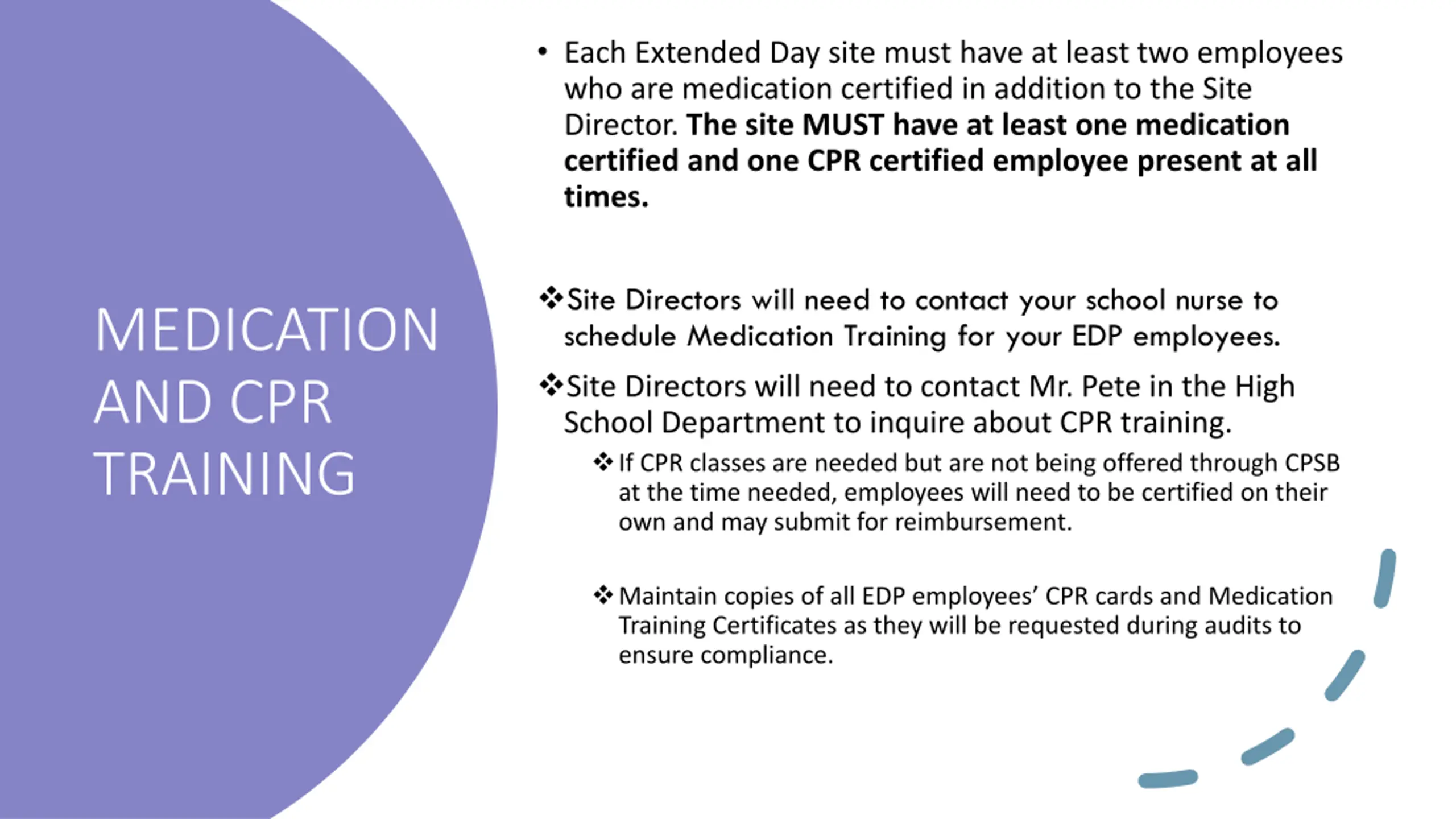 Each Extended Day site must have at least two employees who are medication certified in addition to the Site Director. The site MUST have at least one medication certified and one CPR certified employee present at all times. Site Directors will need to contact your school nurse to schedule Medication Training for your EDP employees. Site Directors will need to contact Mr. Pete in the High School Department to inquire about CPR training. If CPR classes are needed but are not being offered through CPSB at the time needed, employees will need to be certified on their own and may submit for reimbursement. MEDICATION AND CPR TRAINING Maintain copies of all EDP employees CPR cards and Medication Training Certificates as they will be requested during audits to ensure compliance.