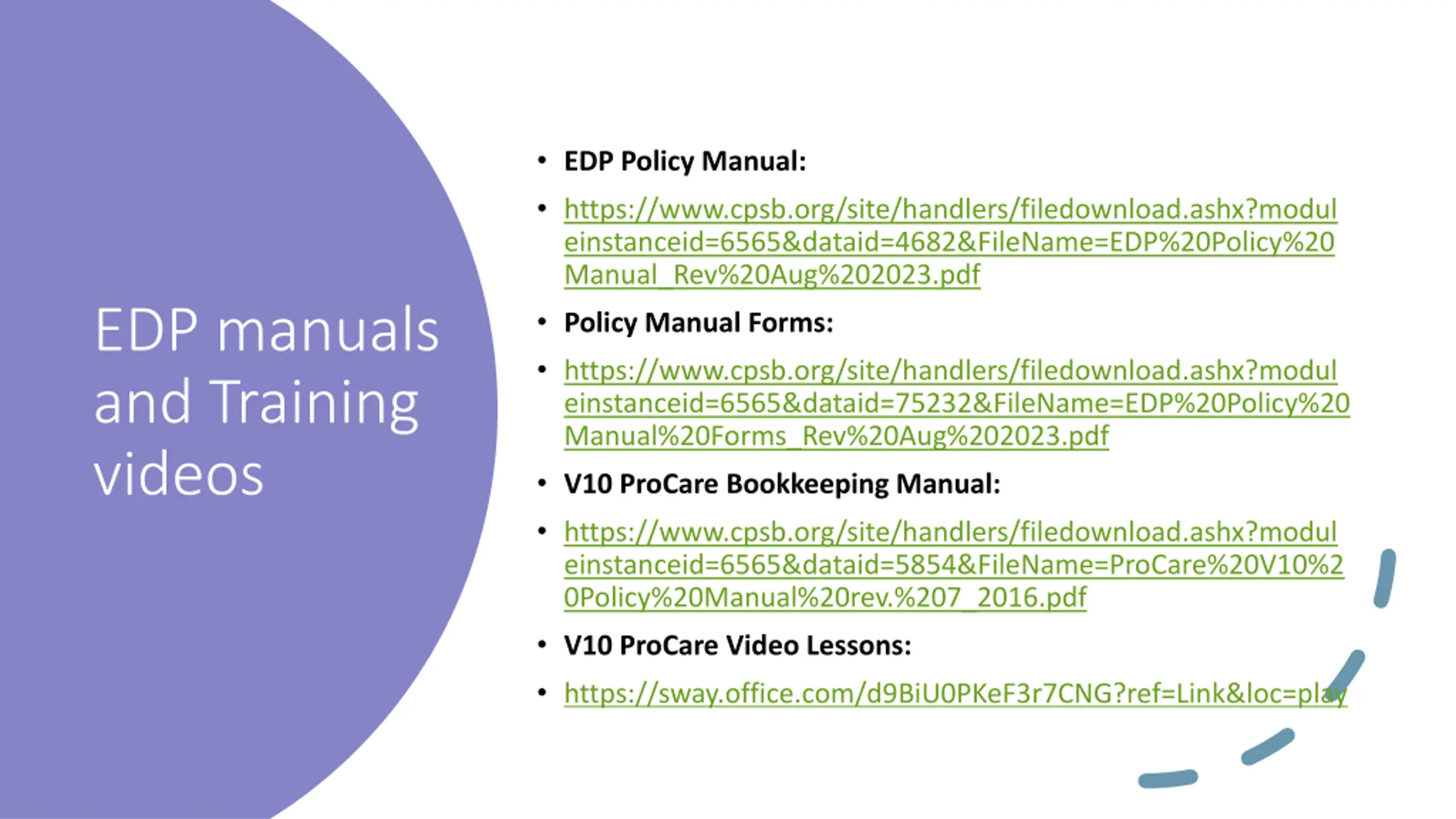 EDP Policy Manual: https://www.cpsb.org/site/handlers/filedownload.ashx?modul einstanceid=6565&dataid=4682&FileName=EDP%20Policy%20 Manual_Rev%20Aug%202023.pdf Policy Manual Forms: https://www.cpsb.org/site/handlers/filedownload.ashx?modul einstanceid=6565&dataid=75232&FileName=EDP%20Policy%20 Manual%20Forms_Rev%20Aug%202023.pdf V10 ProCare Bookkeeping Manual: https://www.cpsb.org/site/handlers/filedownload.ashx?modul einstanceid=6565&dataid=5854&FileName=ProCare%20V10%2 0Policy%20Manual%20rev.%207_2016.pdf V10 ProCare Video Lessons: https://sway.office.com/d9BiU0PKeF3r7CNG?ref=Link&loc=play EDP manuals and Training videos