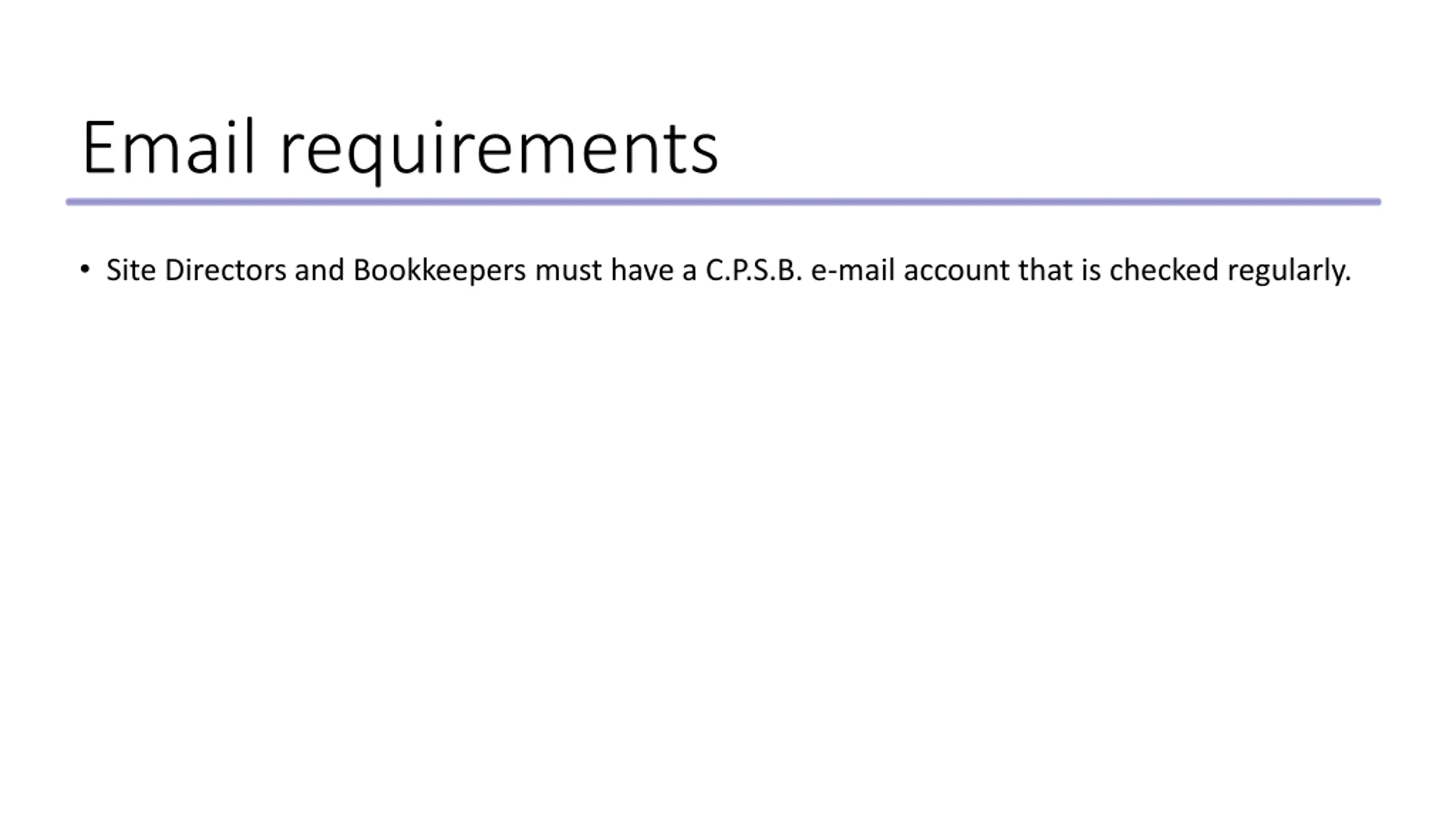 Email requirements Site Directors and Bookkeepers must have a C.P.S.B. e-mail account that is checked regularly.