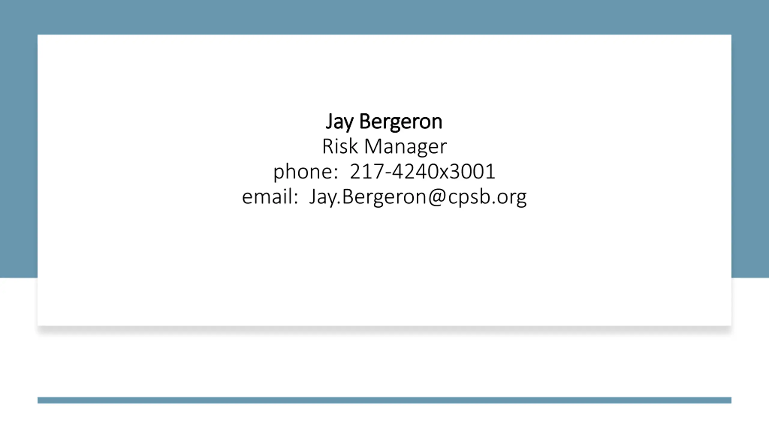 Jay Bergeron Jay Bergeron Risk Manager phone: 217-4240x3001 email: Jay.Bergeron@cpsb.org