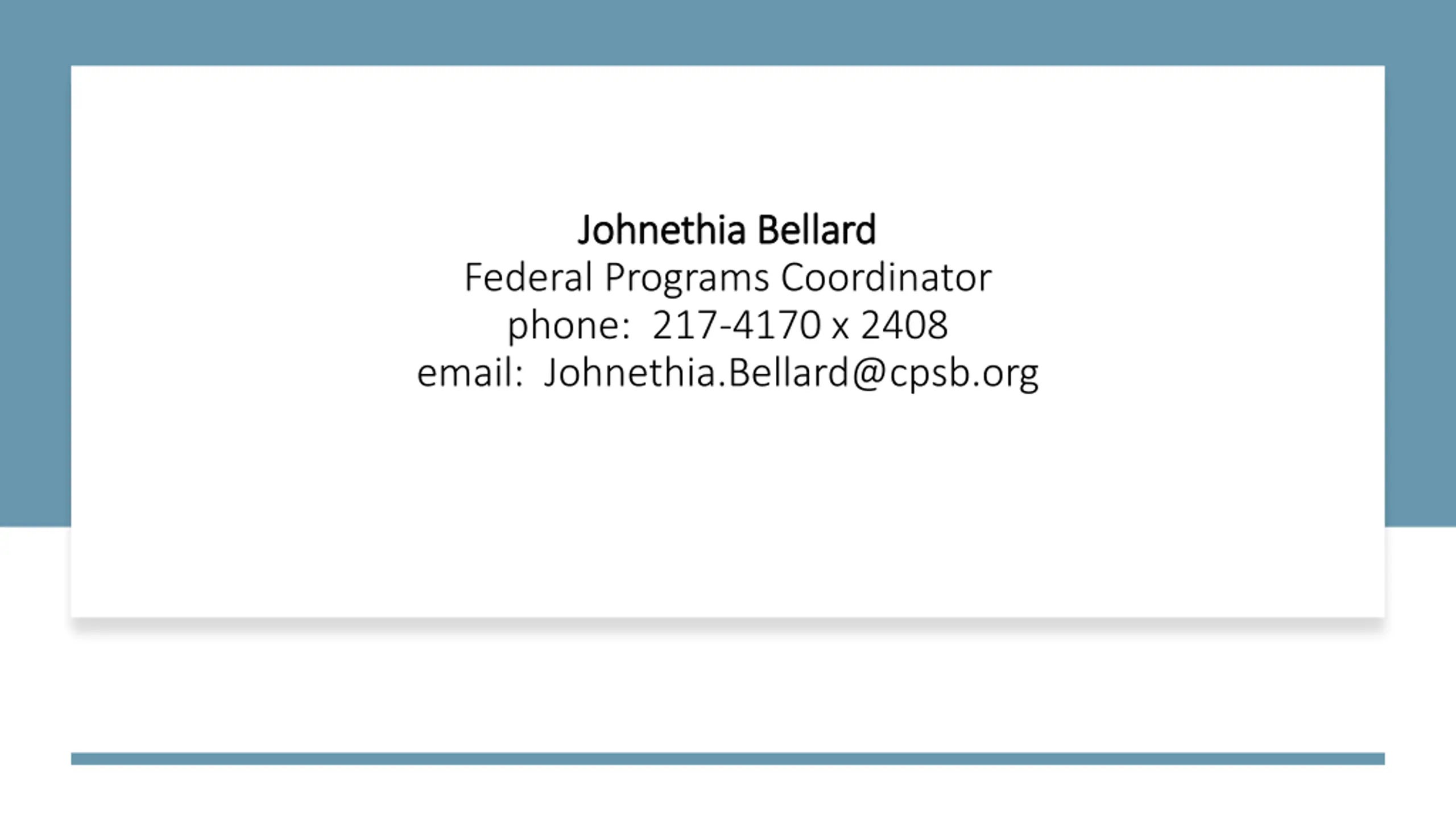 Johnethia Johnethia Bellard Federal Programs Coordinator phone: 217-4170 x 2408 email: Johnethia.Bellard@cpsb.org Bellard