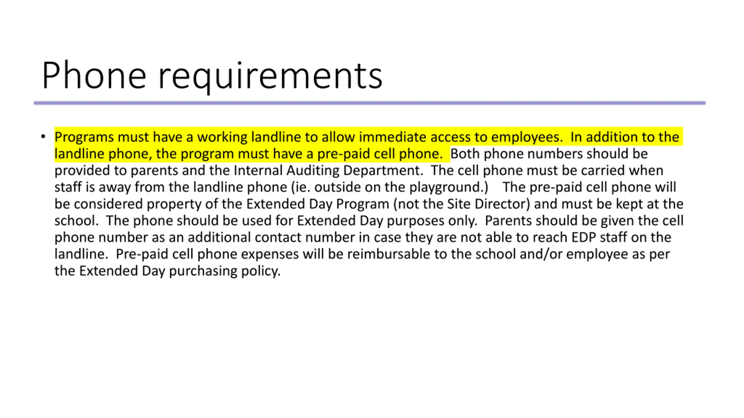 Phone requirements Programs must have a working landline to allow immediate access to employees. In addition to the landline phone, the program must have a pre-paid cell phone. Both phone numbers should be provided to parents and the Internal Auditing Department. The cell phone must be carried when staff is away from the landline phone (ie. outside on the playground.) The pre-paid cell phone will be considered property of the Extended Day Program (not the Site Director) and must be kept at the school. The phone should be used for Extended Day purposes only. Parents should be given the cell phone number as an additional contact number in case they are not able to reach EDP staff on the landline. Pre-paid cell phone expenses will be reimbursable to the school and/or employee as per the Extended Day purchasing policy.