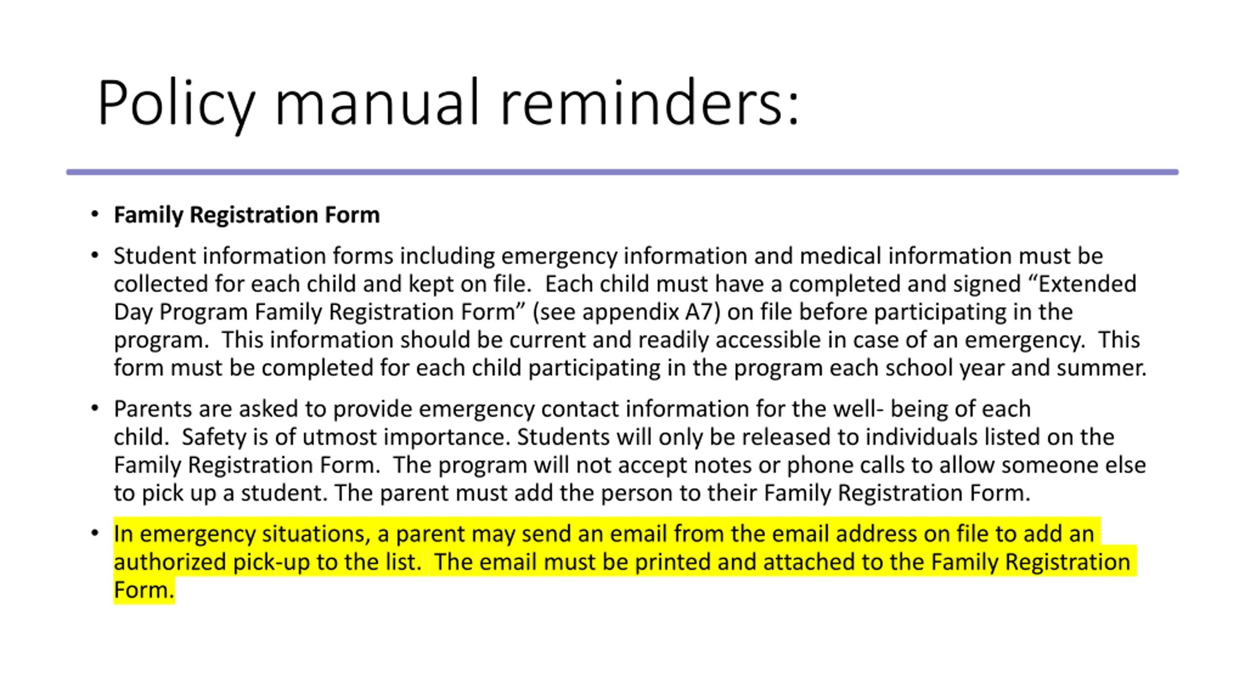 Policy manual reminders: Family Registration Form Student information forms including emergency information and medical information must be collected for each child and kept on file. Each child must have a completed and signed Extended Day Program Family Registration Form (see appendix A7) on file before participating in the program. This information should be current and readily accessible in case of an emergency. This form must be completed for each child participating in the program each school year and summer. Parents are asked to provide emergency contact information for the well- being of each child. Safety is of utmost importance. Students will only be released to individuals listed on the Family Registration Form. The program will not accept notes or phone calls to allow someone else to pick up a student. The parent must add the person to their Family Registration Form. In emergency situations, a parent may send an email from the email address on file to add an authorized pick-up to the list. The email must be printed and attached to the Family Registration Form.