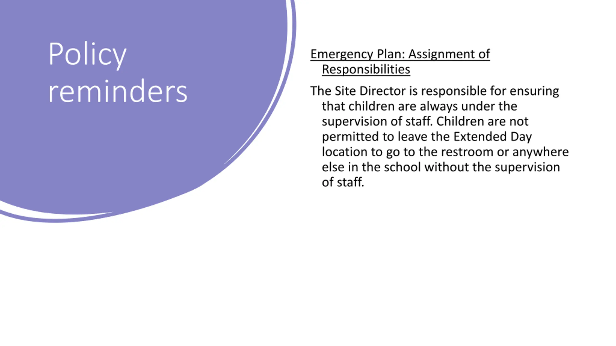 Policy reminders Emergency Plan: Assignment of Responsibilities The Site Director is responsible for ensuring that children are always under the supervision of staff. Children are not permitted to leave the Extended Day location to go to the restroom or anywhere else in the school without the supervision of staff.