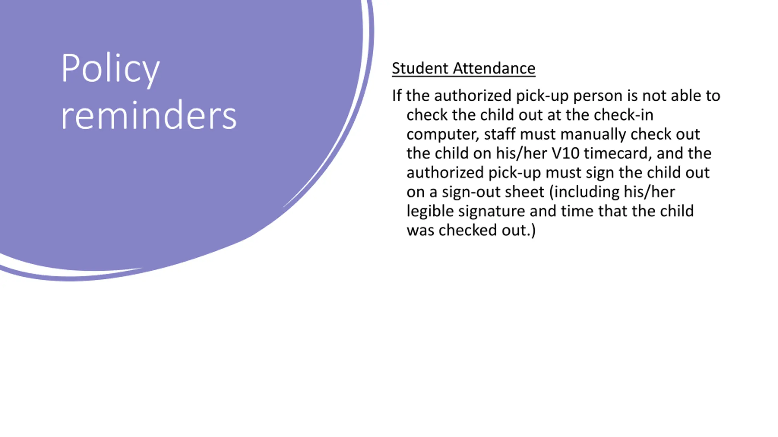 Policy reminders Student Attendance If the authorized pick-up person is not able to check the child out at the check-in computer, staff must manually check out the child on his/her V10 timecard, and the authorized pick-up must sign the child out on a sign-out sheet (including his/her legible signature and time that the child was checked out.)