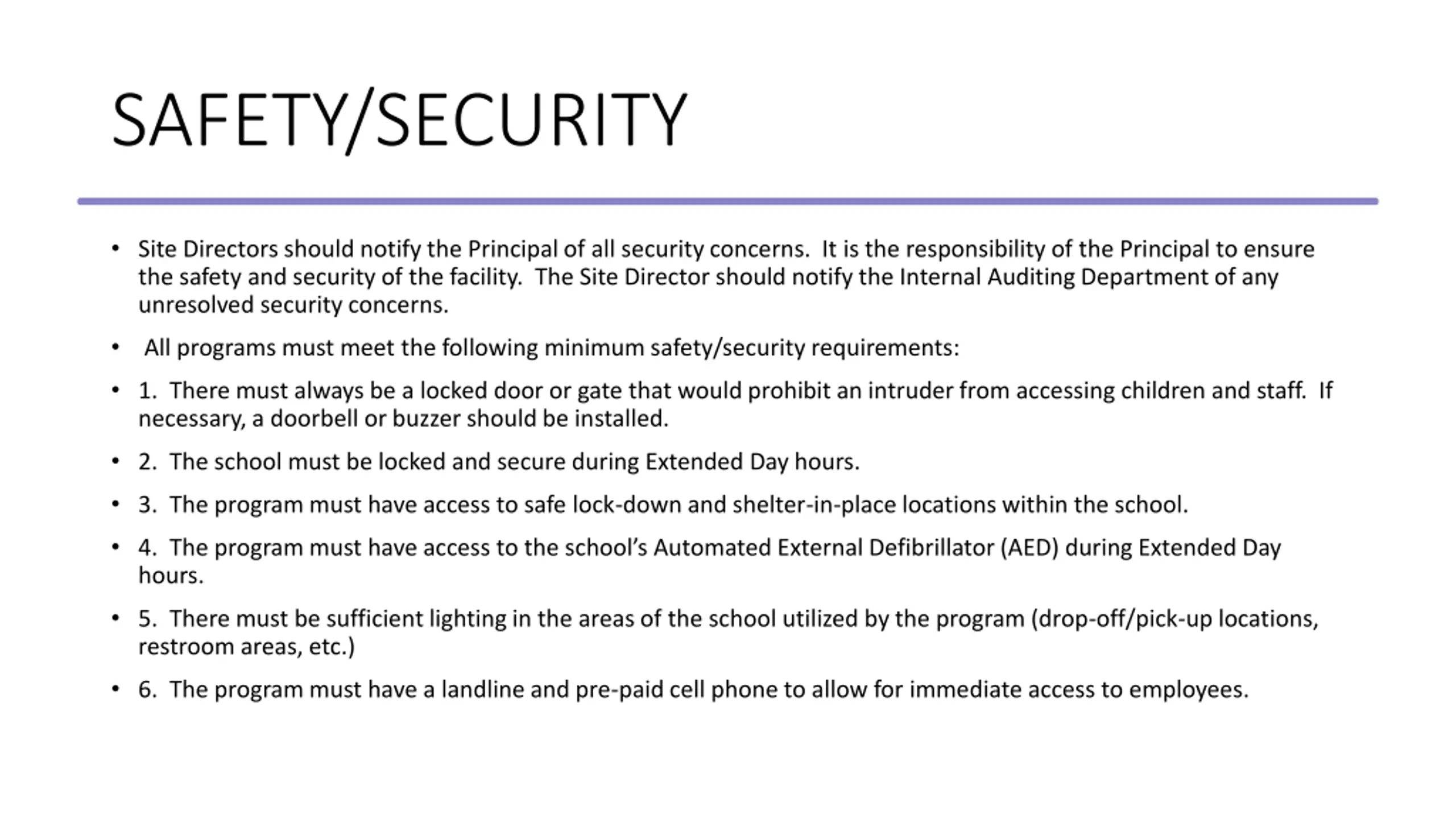 SAFETY/SECURITY Site Directors should notify the Principal of all security concerns. It is the responsibility of the Principal to ensure the safety and security of the facility. The Site Director should notify the Internal Auditing Department of any unresolved security concerns. All programs must meet the following minimum safety/security requirements: 1. There must always be a locked door or gate that would prohibit an intruder from accessing children and staff. If necessary, a doorbell or buzzer should be installed. 2. The school must be locked and secure during Extended Day hours. 3. The program must have access to safe lock-down and shelter-in-place locations within the school. 4. The program must have access to the school s Automated External Defibrillator (AED) during Extended Day hours. 5. There must be sufficient lighting in the areas of the school utilized by the program (drop-off/pick-up locations, restroom areas, etc.) 6. The program must have a landline and pre-paid cell phone to allow for immediate access to employees.