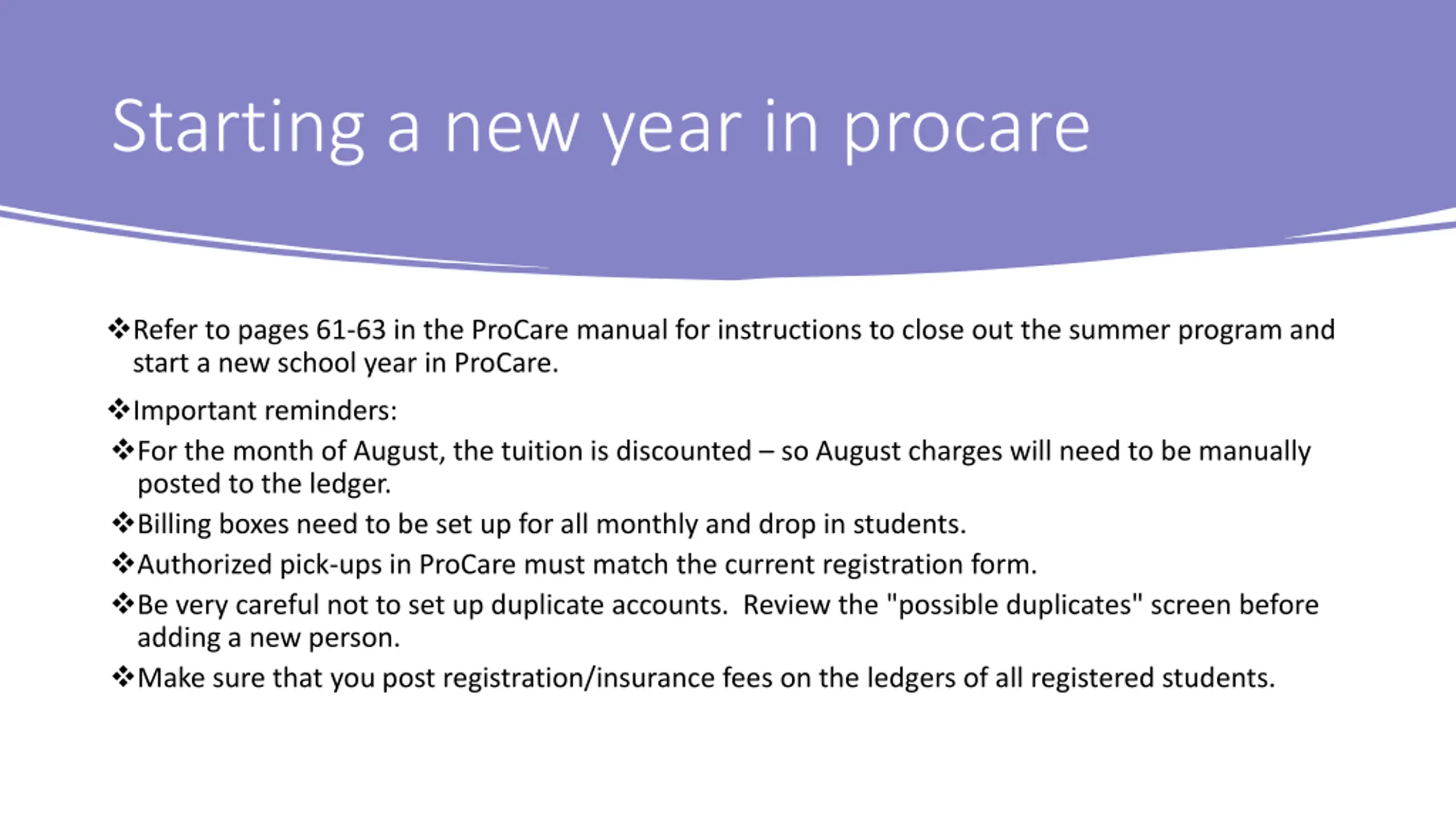 Starting a new year in procare Refer to pages 61-63 in the ProCare manual for instructions to close out the summer program and start a new school year in ProCare. Important reminders: For the month of August, the tuition is discounted so August charges will need to be manually posted to the ledger. Billing boxes need to be set up for all monthly and drop in students. Authorized pick-ups in ProCare must match the current registration form. Be very careful not to set up duplicate accounts. Review the "possible duplicates" screen before adding a new person. Make sure that you post registration/insurance fees on the ledgers of all registered students.