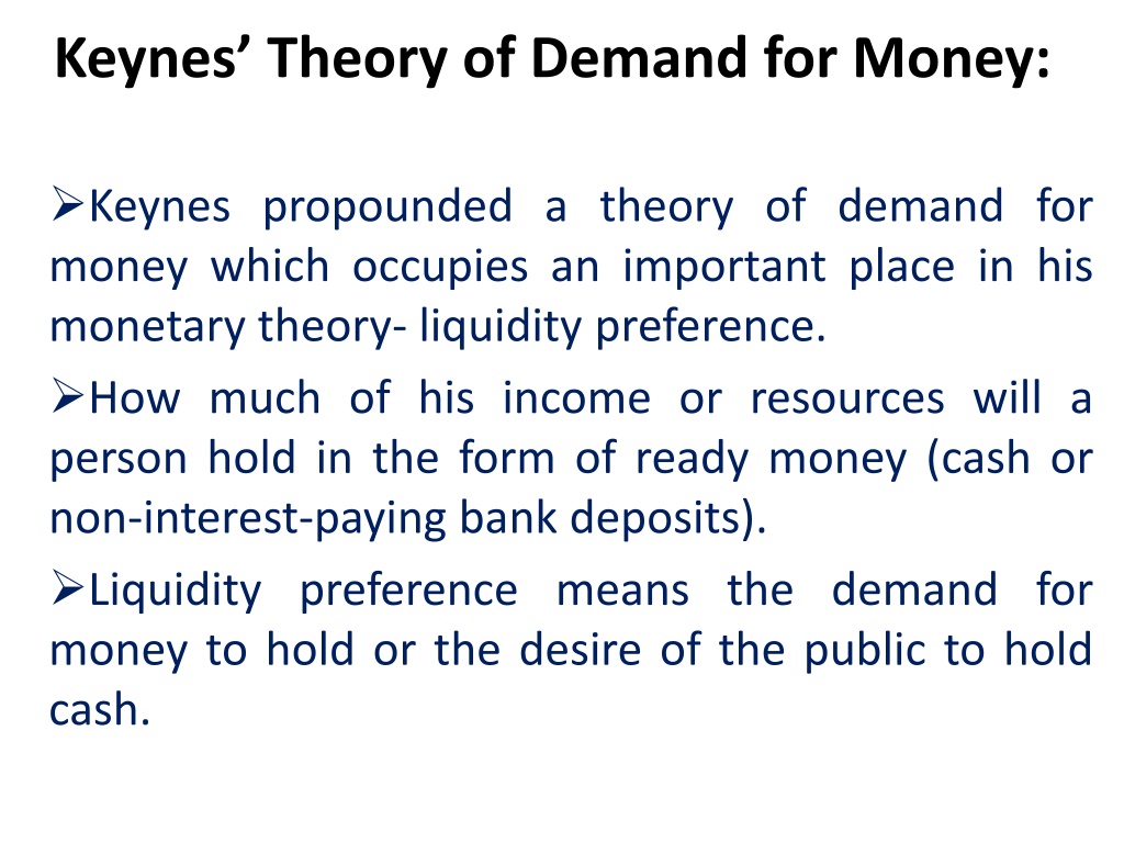Keynes Theory of Demand for Money: Keynes propounded a theory of demand for money which occupies an important place in his monetary theory- liquidity preference. How much of his income or resources will a person hold in the form of ready money (cash or non-interest-paying bank deposits). Liquidity preference means the demand for money to hold or the desire of the public to hold cash.