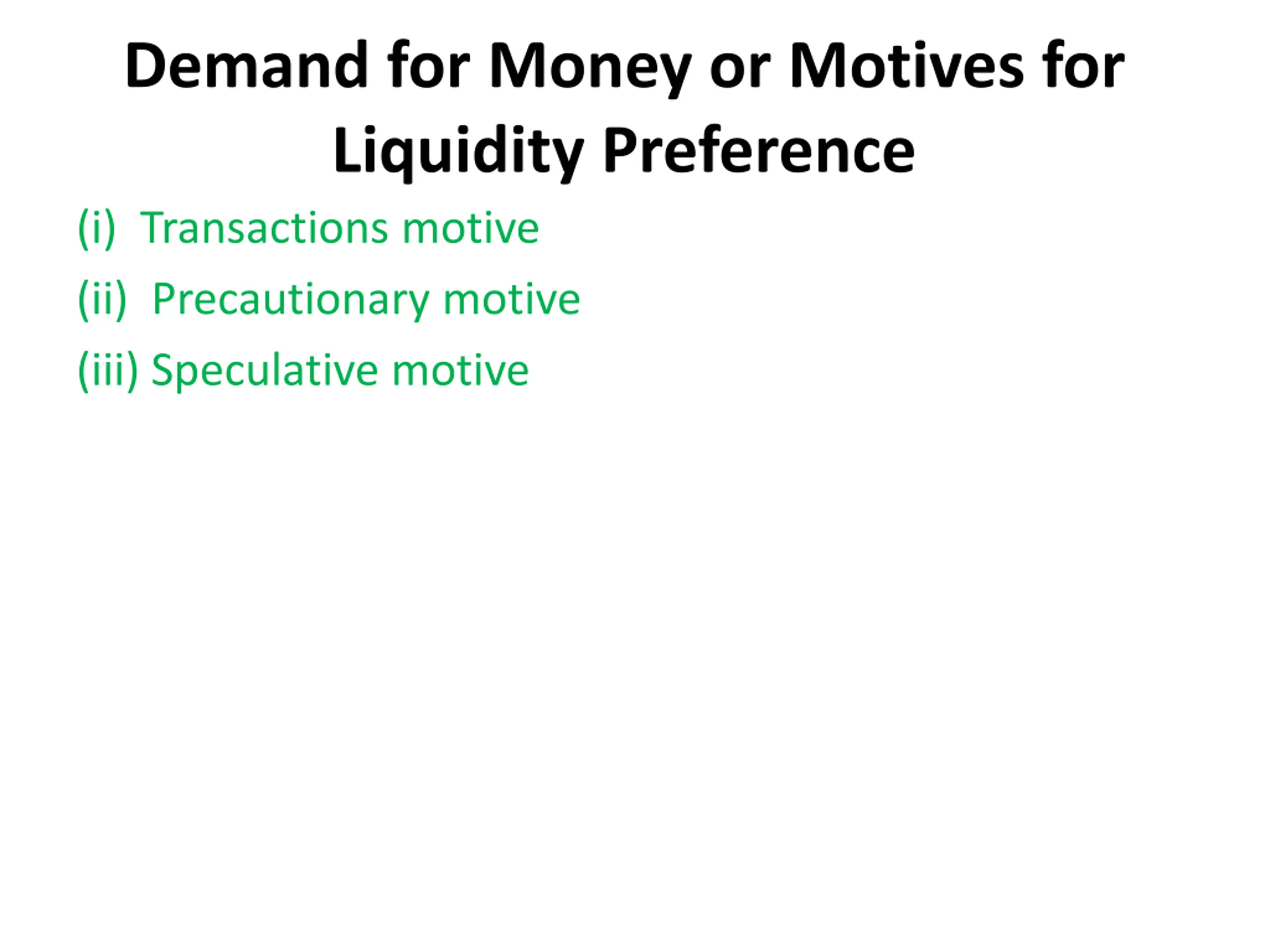 Demand for Money or Motives for Liquidity Preference (i) Transactions motive (ii) Precautionary motive (iii) Speculative motive
