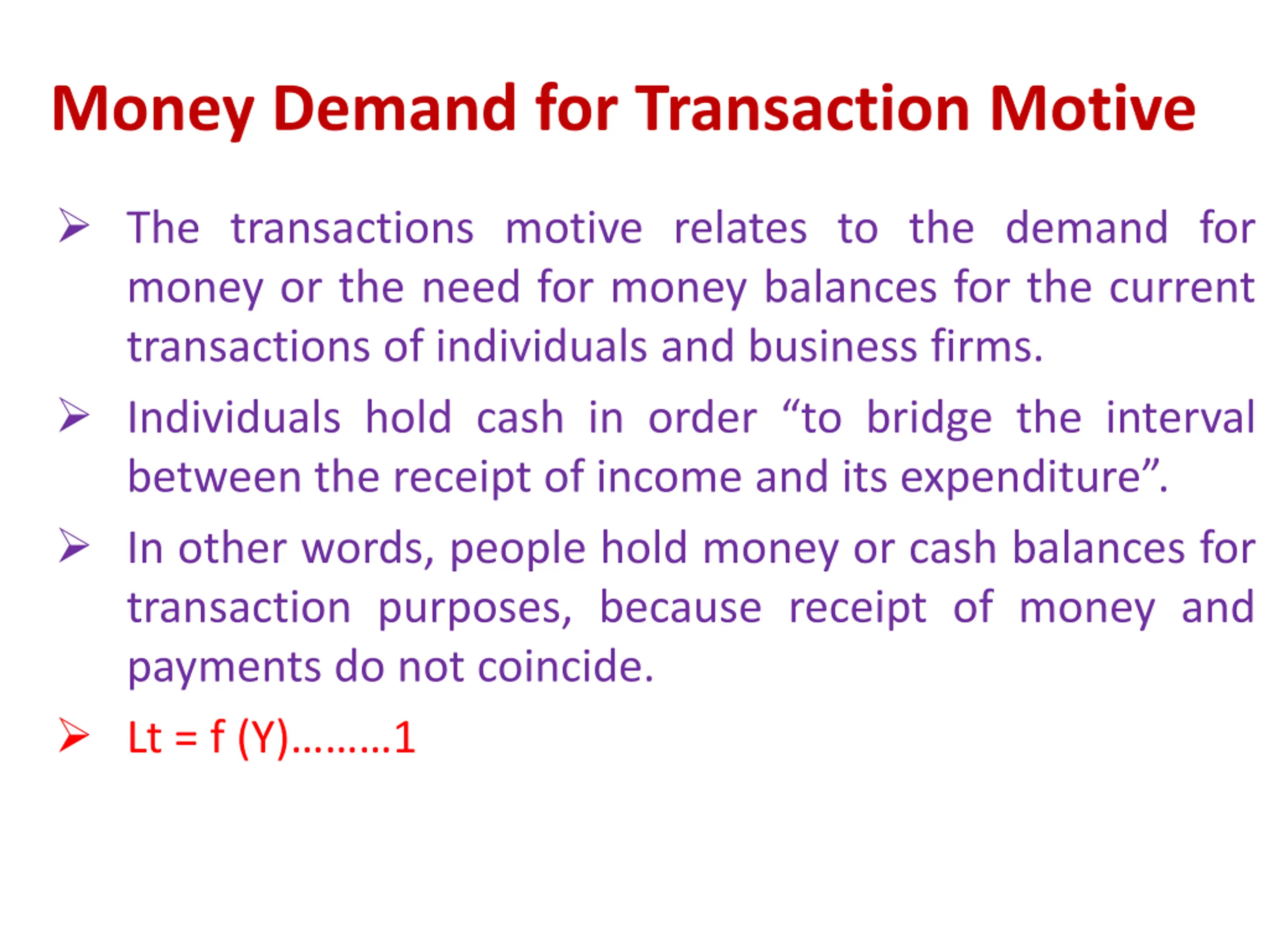 Money Demand for Transaction Motive The transactions motive relates to the demand for money or the need for money balances for the current transactions of individuals and business firms. Individuals hold cash in order to bridge the interval between the receipt of income and its expenditure . In other words, people hold money or cash balances for transaction purposes, because receipt of money and payments do not coincide. Lt = f (Y) 1
