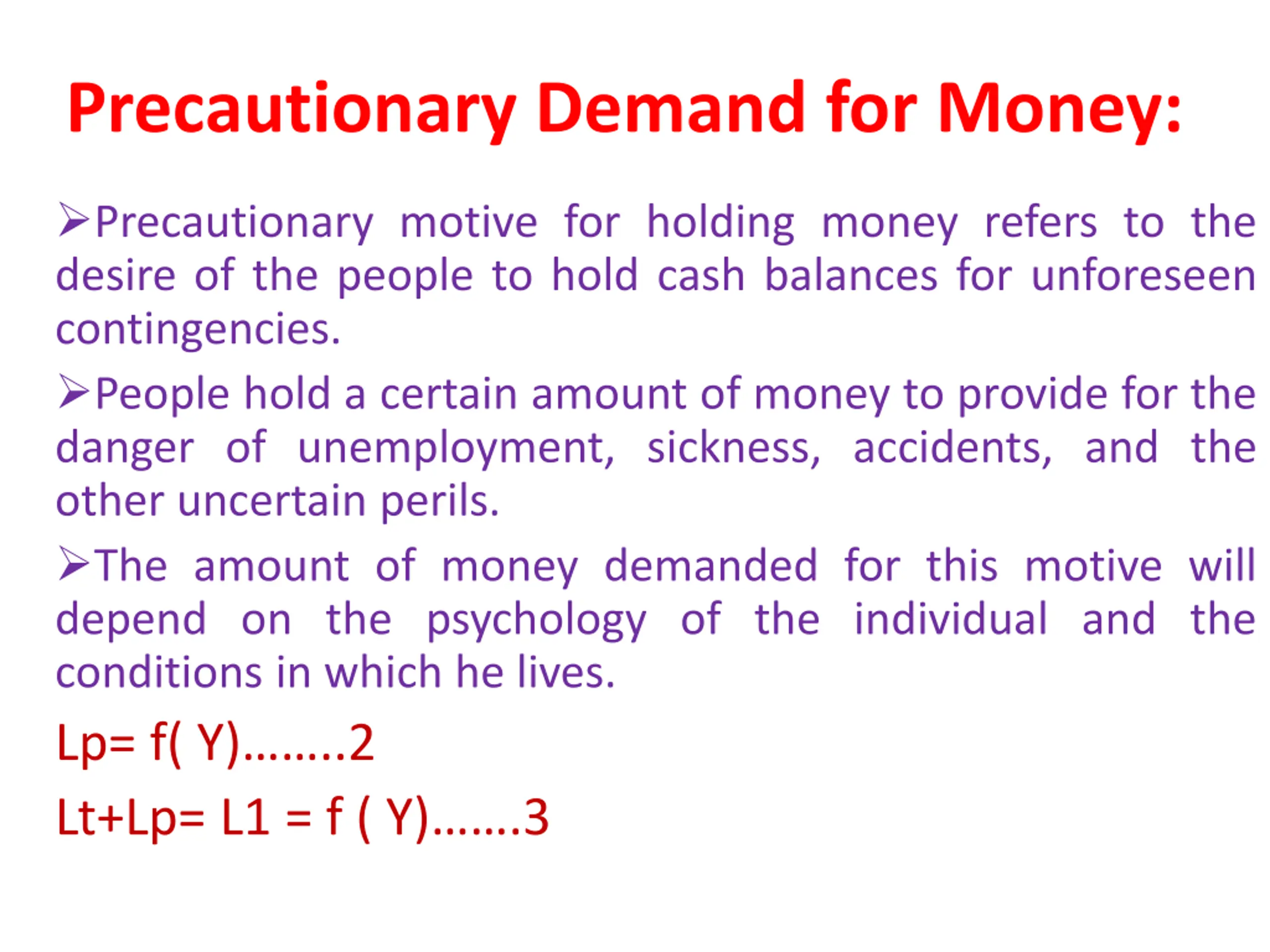 Precautionary Demand for Money: Precautionary motive for holding money refers to the desire of the people to hold cash balances for unforeseen contingencies. People hold a certain amount of money to provide for the danger of unemployment, sickness, accidents, and the other uncertain perils. The amount of money demanded for this motive will depend on the psychology of the individual and the conditions in which he lives. Lp= f( Y) ..2 Lt+Lp= L1 = f ( Y) .3