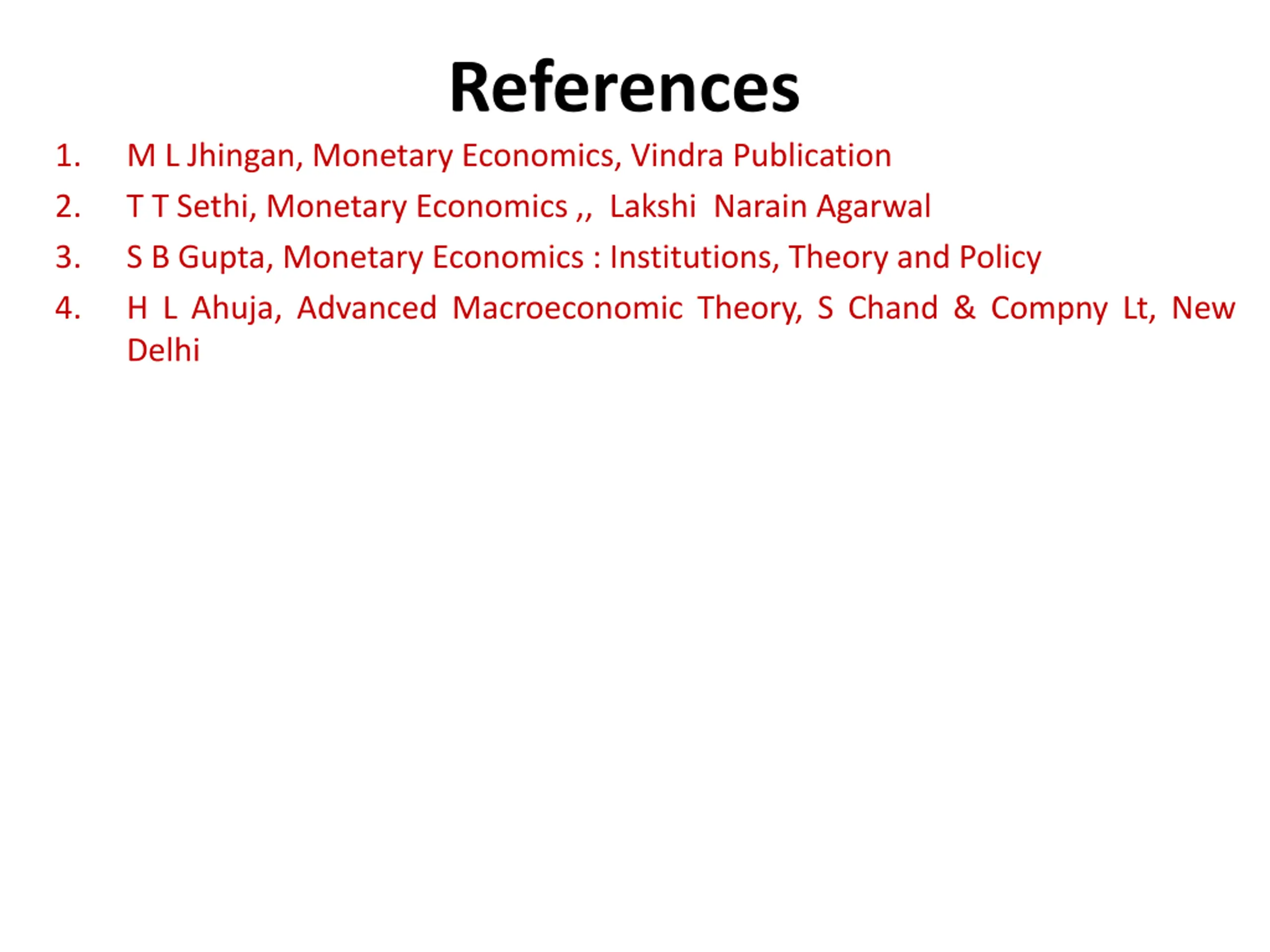 References 1. 2. 3. 4. M L Jhingan, Monetary Economics, Vindra Publication T T Sethi, Monetary Economics ,, Lakshi Narain Agarwal S B Gupta, Monetary Economics : Institutions, Theory and Policy H L Ahuja, Advanced Macroeconomic Theory, S Chand & Compny Lt, New Delhi