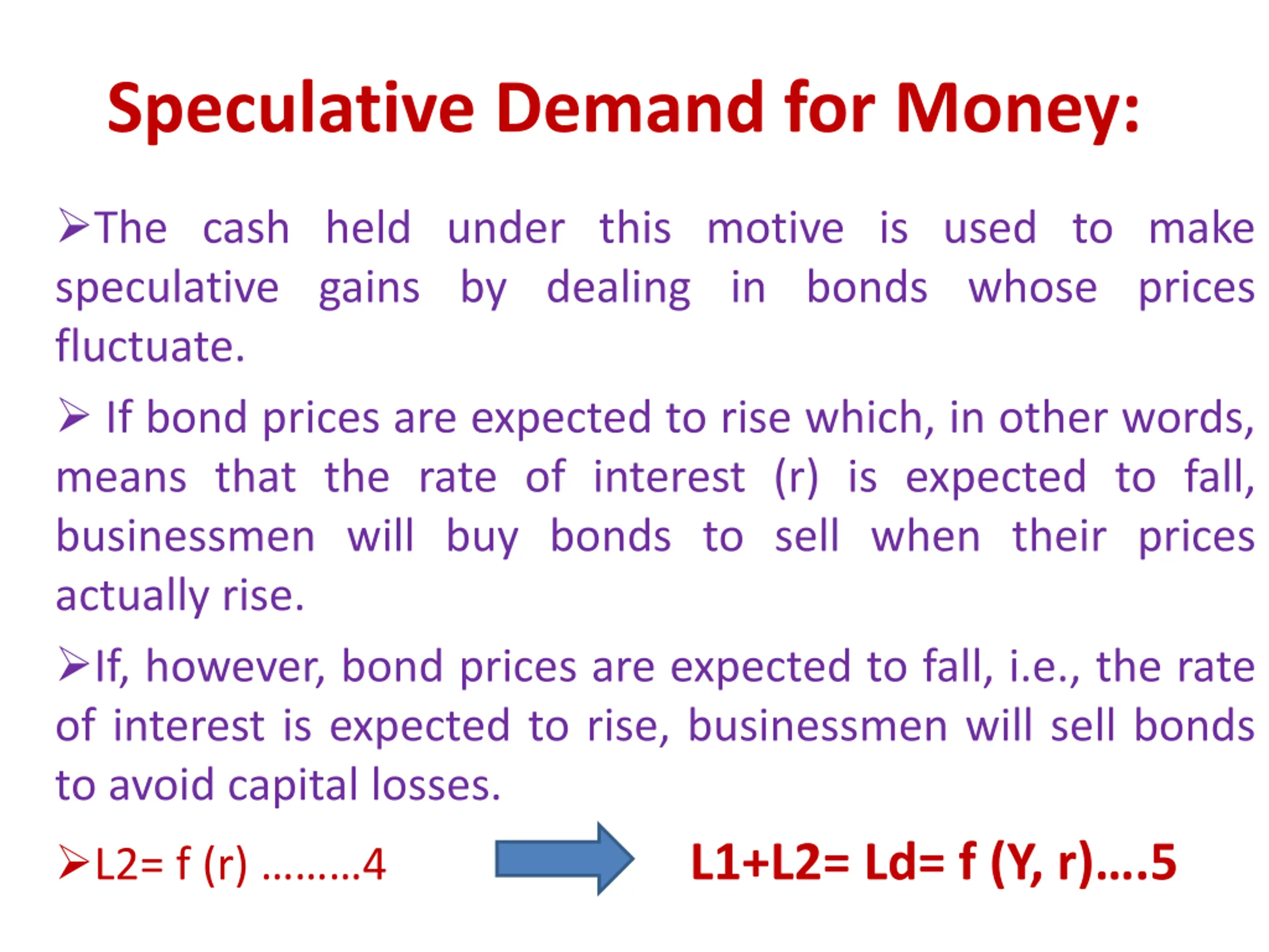 Speculative Demand for Money: The cash held under this motive is used to make speculative gains by dealing in bonds whose prices fluctuate. If bond prices are expected to rise which, in other words, means that the rate of interest (r) is expected to fall, businessmen will buy bonds to sell when their prices actually rise. If, however, bond prices are expected to fall, i.e., the rate of interest is expected to rise, businessmen will sell bonds to avoid capital losses. L2= f (r) 4 L1+L2= Ld= f (Y, r) .5