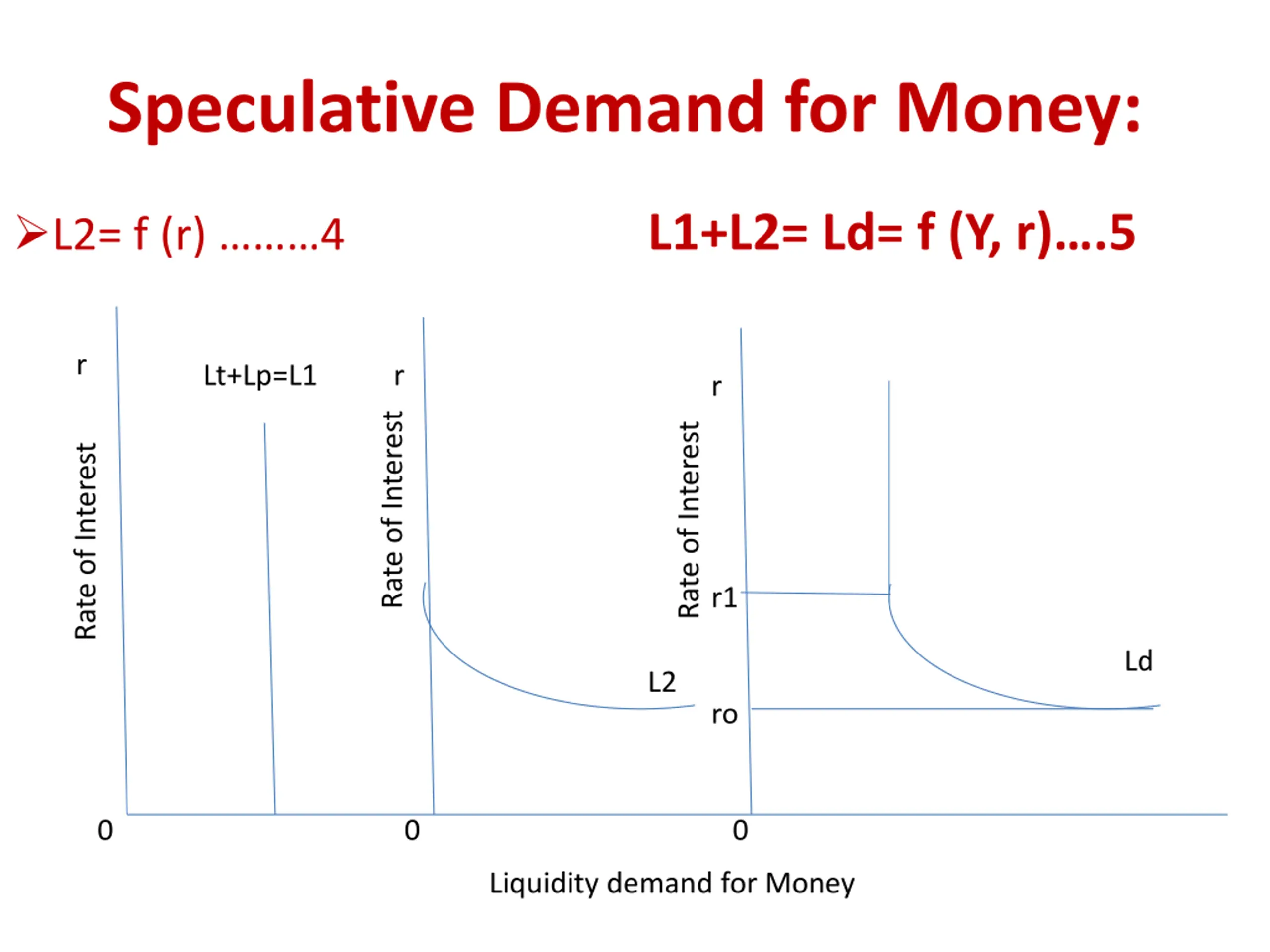 Speculative Demand for Money: L2= f (r) 4 L1+L2= Ld= f (Y, r) .5 r Lt+Lp=L1 r r Rate of Interest Rate of Interest Rate of Interest r1 Ld L2 ro 0 0 0 Liquidity demand for Money