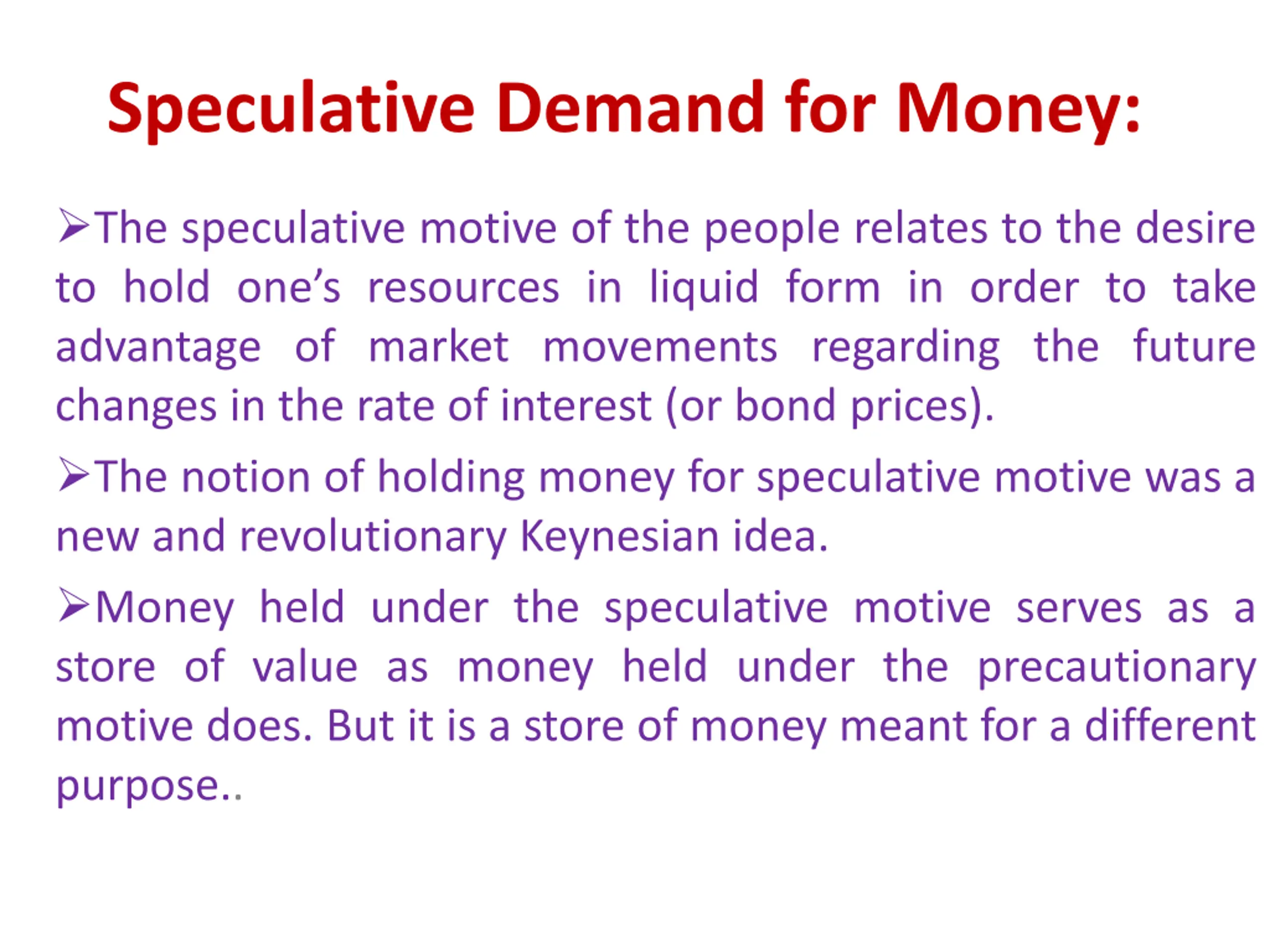 Speculative Demand for Money: The speculative motive of the people relates to the desire to hold one s resources in liquid form in order to take advantage of market movements regarding the future changes in the rate of interest (or bond prices). The notion of holding money for speculative motive was a new and revolutionary Keynesian idea. Money held under the speculative motive serves as a store of value as money held under the precautionary motive does. But it is a store of money meant for a different purpose..
