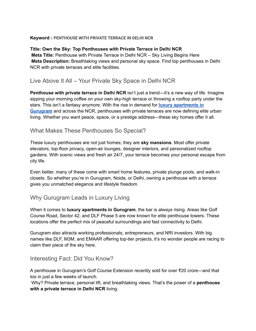 Keyword : PENTHOUSE WITH PRIVATE TERRACE IN DELHI NCR Title: Own the Sky: Top Penthouses with Private Terrace in Delhi NCR Meta Title: Penthouse with Private Terrace in Delhi NCR Sky Living Begins Here Meta Description: Breathtaking views and personal sky space. Find top penthouses in Delhi NCR with private terraces and elite facilities. Live Above It All Your Private Sky Space in Delhi NCR Penthouse with private terrace in Delhi NCR isn t just a trend it s a new way of life. Imagine sipping your morning coffee on your own sky-high terrace or throwing a rooftop party under the stars. This isn t a fantasy anymore. With the rise in demand for luxury apartments in Gurugram and across the NCR, penthouses with private terraces are now defining elite urban living. Whether you want peace, space, or a prestige address these sky homes offer it all. What Makes These Penthouses So Special? These luxury penthouses are not just homes; they are sky mansions. Most offer private elevators, top-floor privacy, open-air lounges, designer interiors, and personalized rooftop gardens. With scenic views and fresh air 24/7, your terrace becomes your personal escape from city life. Even better, many of these come with smart home features, private plunge pools, and walk-in closets. So whether you re in Gurugram, Noida, or Delhi, owning a penthouse with a terrace gives you unmatched elegance and lifestyle freedom. Why Gurugram Leads in Luxury Living When it comes to luxury apartments in Gurugram, the bar is always rising. Areas like Golf Course Road, Sector 42, and DLF Phase 5 are now known for elite penthouse towers. These locations offer the perfect mix of peaceful surroundings and fast connectivity to Delhi. Gurugram also attracts working professionals, entrepreneurs, and NRI investors. With big names like DLF, M3M, and EMAAR offering top-tier projects, it s no wonder people are racing to claim their piece of the sky here. Interesting Fact: Did You Know? A penthouse in Gurugram s Golf Course Extension recently sold for over 20 crore and that too in just a few weeks of launch. Why? Private terrace, personal lift, and breathtaking views. That s the power of a penthouse with a private terrace in Delhi NCR living.