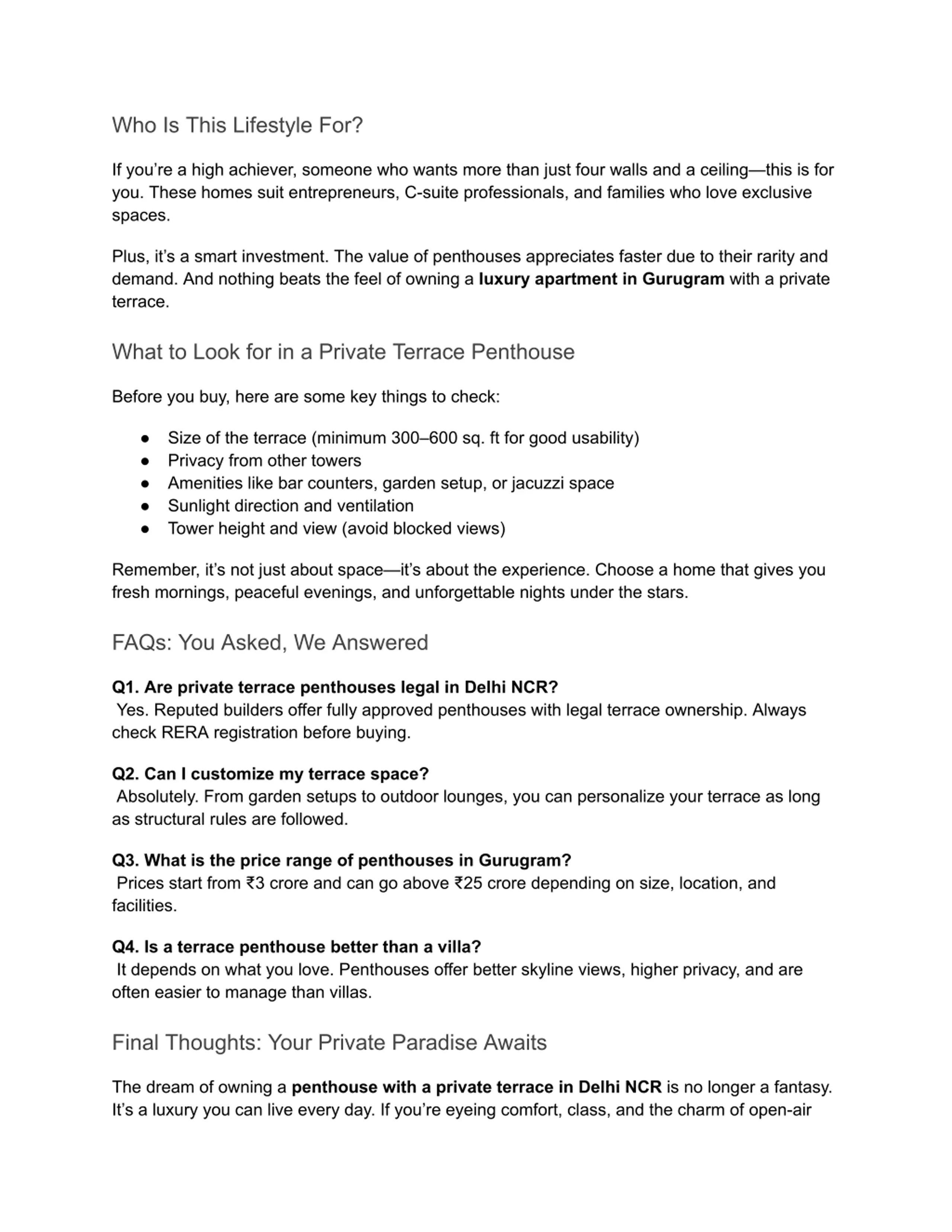 Who Is This Lifestyle For? If you re a high achiever, someone who wants more than just four walls and a ceiling this is for you. These homes suit entrepreneurs, C-suite professionals, and families who love exclusive spaces. Plus, it s a smart investment. The value of penthouses appreciates faster due to their rarity and demand. And nothing beats the feel of owning a luxury apartment in Gurugram with a private terrace. What to Look for in a Private Terrace Penthouse Before you buy, here are some key things to check: Size of the terrace (minimum 300 600 sq. ft for good usability) Privacy from other towers Amenities like bar counters, garden setup, or jacuzzi space Sunlight direction and ventilation Tower height and view (avoid blocked views) Remember, it s not just about space it s about the experience. Choose a home that gives you fresh mornings, peaceful evenings, and unforgettable nights under the stars. FAQs: You Asked, We Answered Q1. Are private terrace penthouses legal in Delhi NCR? Yes. Reputed builders offer fully approved penthouses with legal terrace ownership. Always check RERA registration before buying. Q2. Can I customize my terrace space? Absolutely. From garden setups to outdoor lounges, you can personalize your terrace as long as structural rules are followed. Q3. What is the price range of penthouses in Gurugram? Prices start from 3 crore and can go above 25 crore depending on size, location, and facilities. Q4. Is a terrace penthouse better than a villa? It depends on what you love. Penthouses offer better skyline views, higher privacy, and are often easier to manage than villas. Final Thoughts: Your Private Paradise Awaits The dream of owning a penthouse with a private terrace in Delhi NCR is no longer a fantasy. It s a luxury you can live every day. If you re eyeing comfort, class, and the charm of open-air