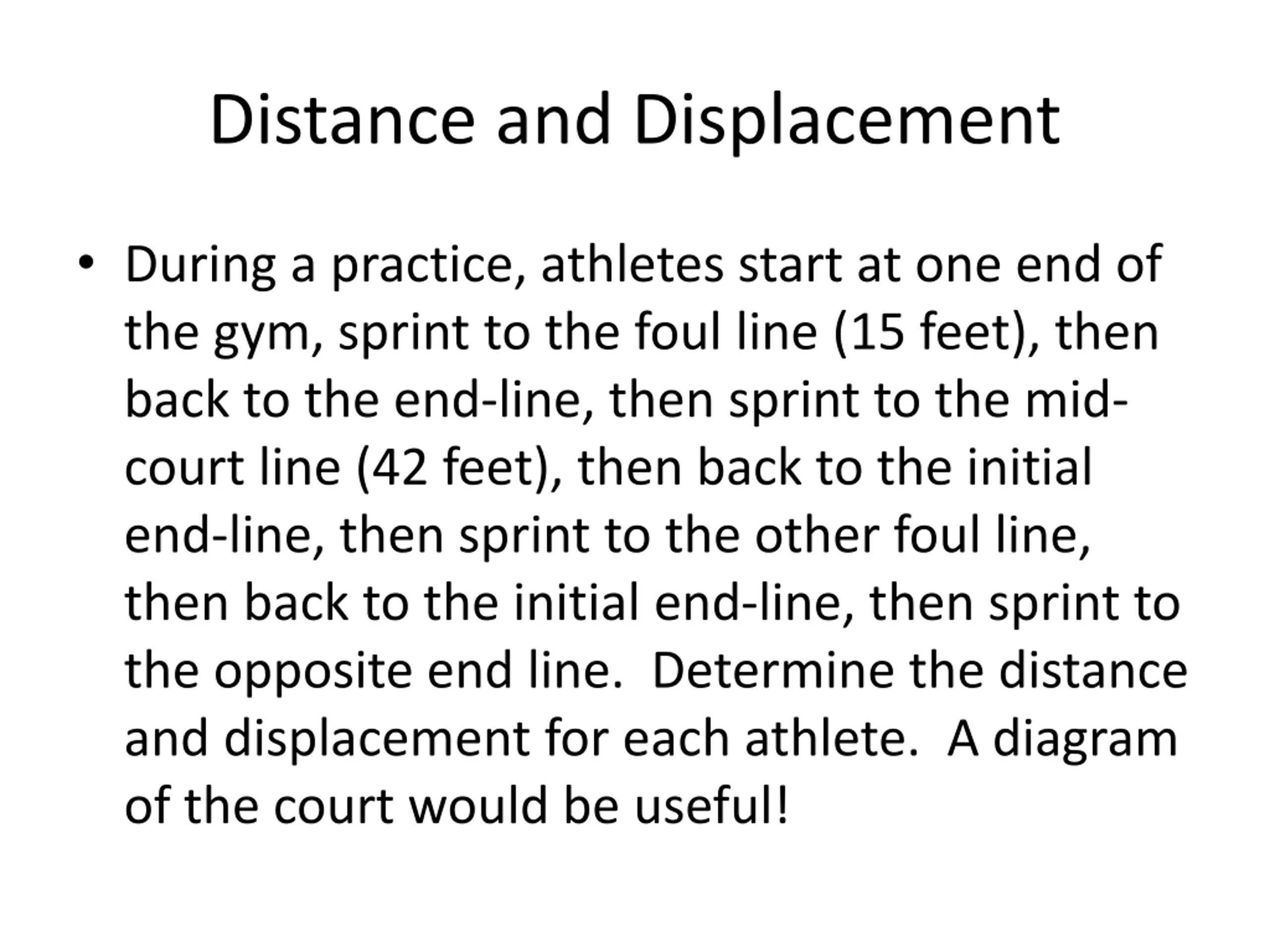 Distance and Displacement During a practice, athletes start at one end of the gym, sprint to the foul line (15 feet), then back to the end-line, then sprint to the mid- court line (42 feet), then back to the initial end-line, then sprint to the other foul line, then back to the initial end-line, then sprint to the opposite end line. Determine the distance and displacement for each athlete. A diagram of the court would be useful!