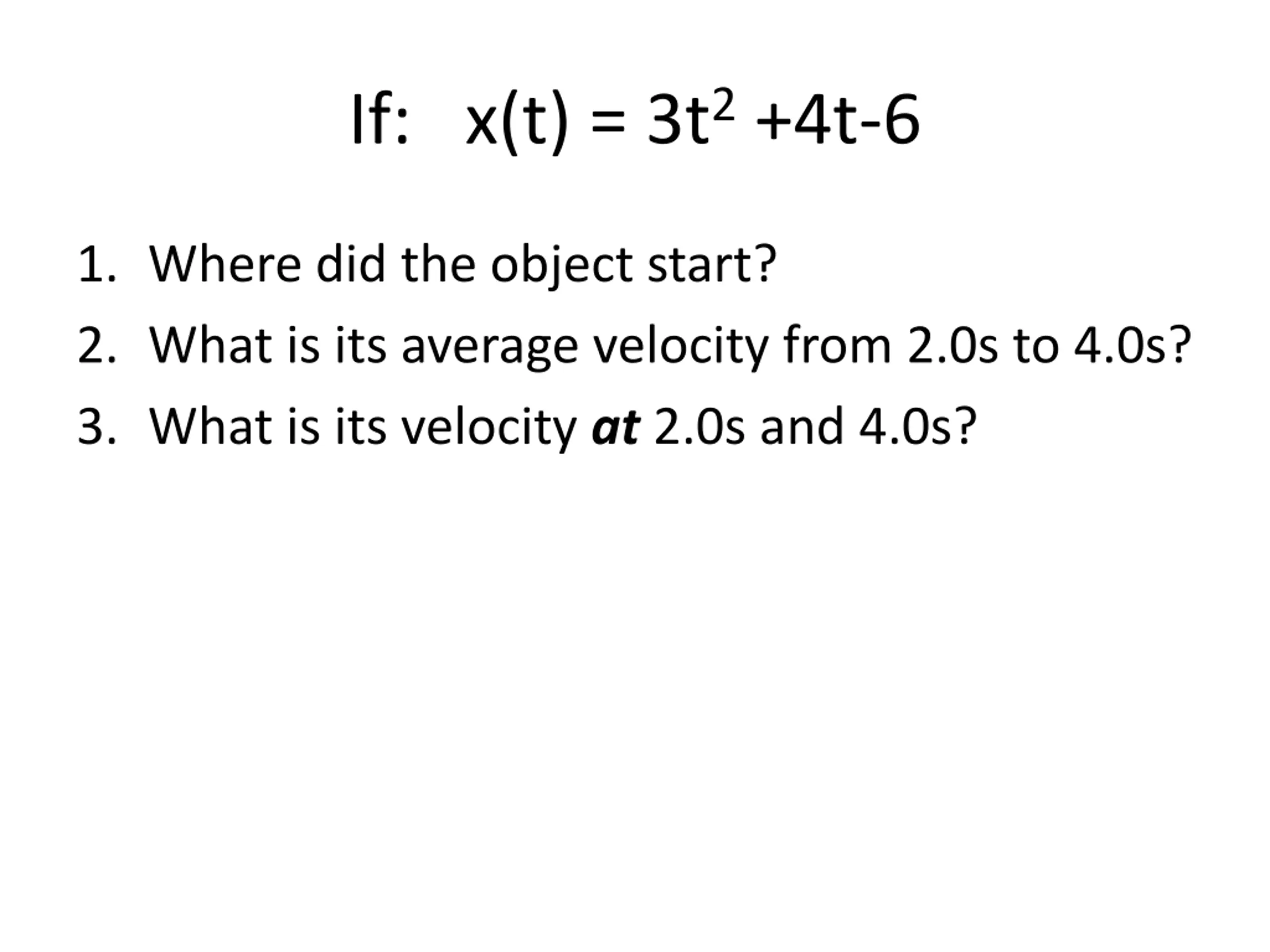 If: x(t) = 3t2+4t-6 1. Where did the object start? 2. What is its average velocity from 2.0s to 4.0s? 3. What is its velocity at 2.0s and 4.0s?