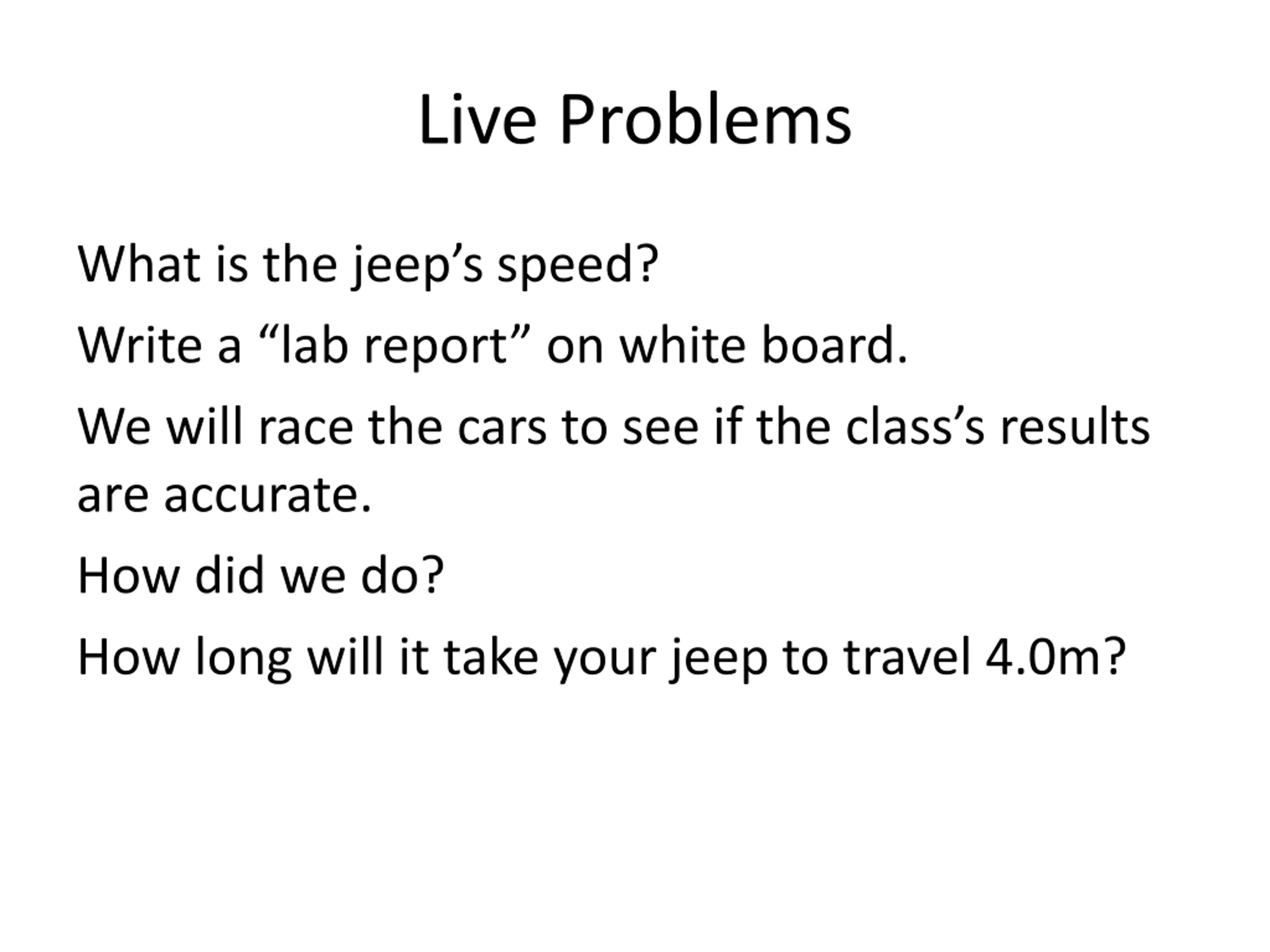 Live Problems What is the jeep s speed? Write a lab report on white board. We will race the cars to see if the class s results are accurate. How did we do? How long will it take your jeep to travel 4.0m?