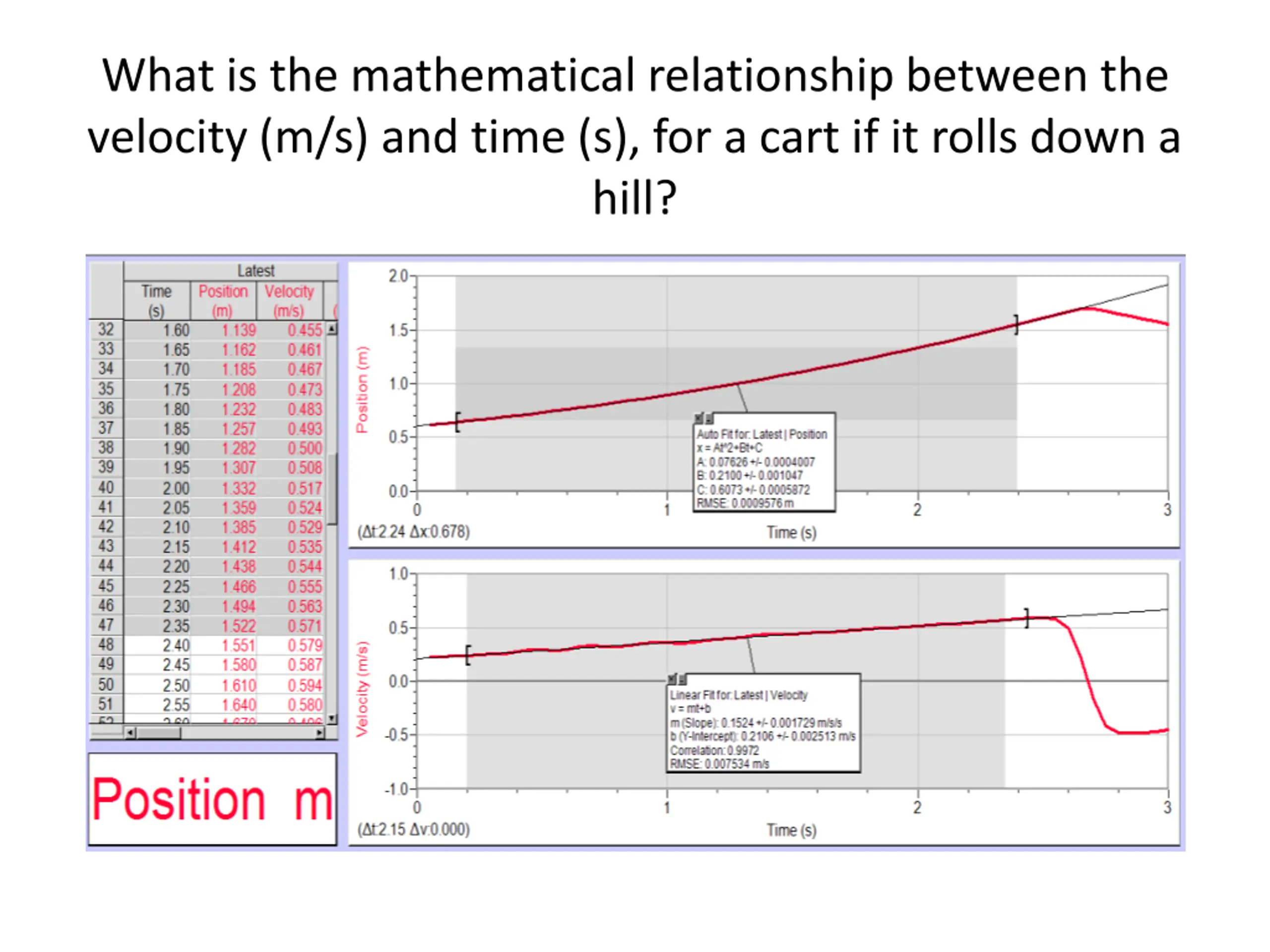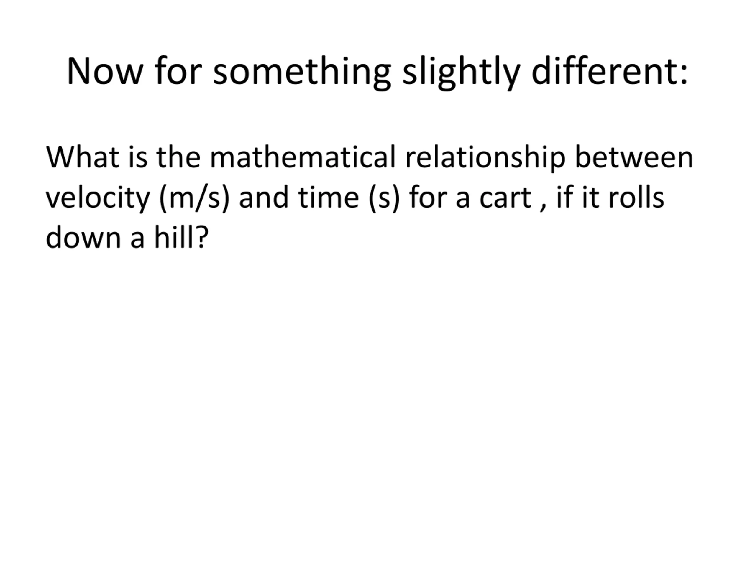 Now for something slightly different: What is the mathematical relationship between velocity (m/s) and time (s) for a cart , if it rolls down a hill?