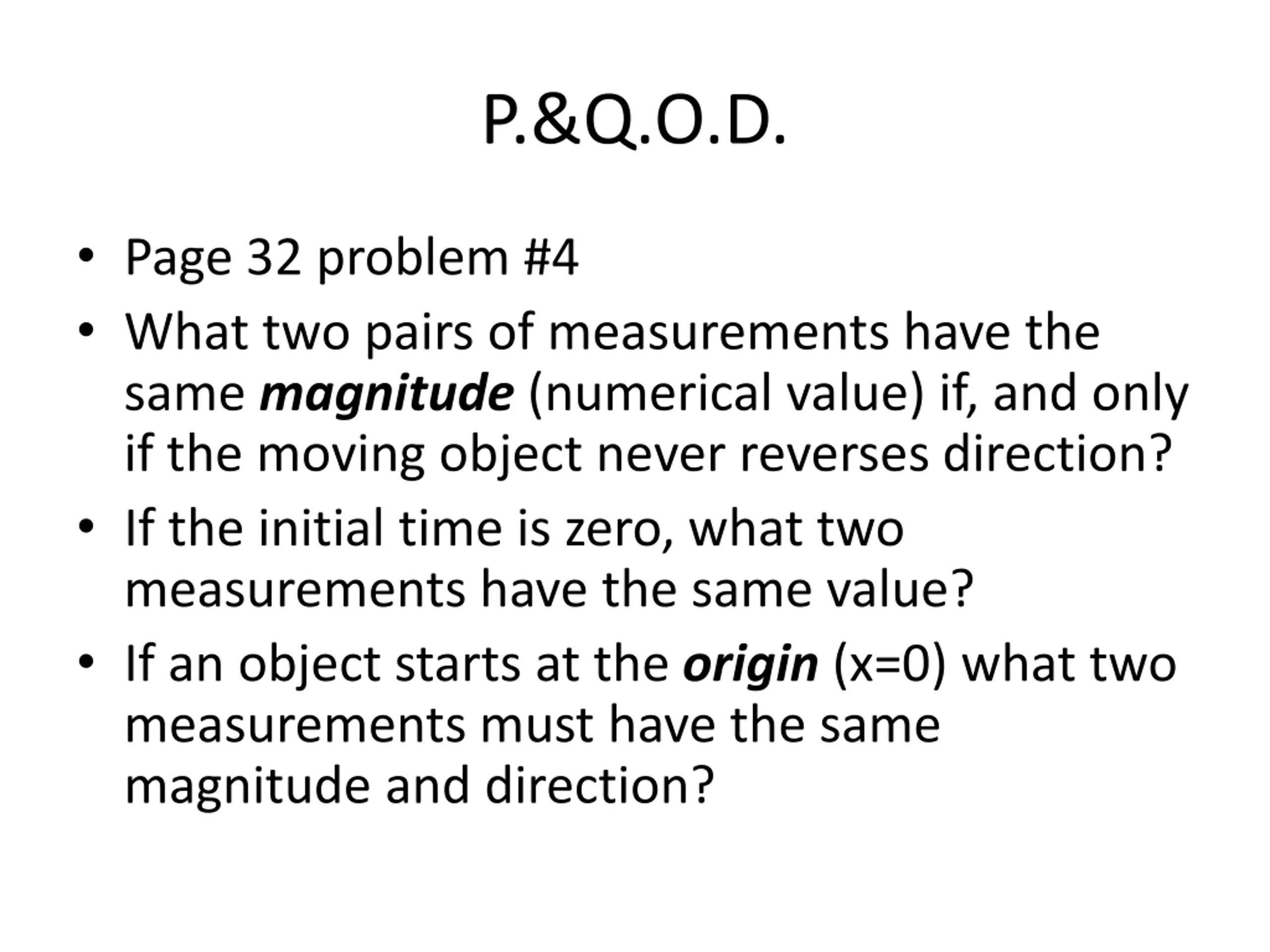 P.&Q.O.D. Page 32 problem #4 What two pairs of measurements have the same magnitude (numerical value) if, and only if the moving object never reverses direction? If the initial time is zero, what two measurements have the same value? If an object starts at the origin (x=0) what two measurements must have the same magnitude and direction?